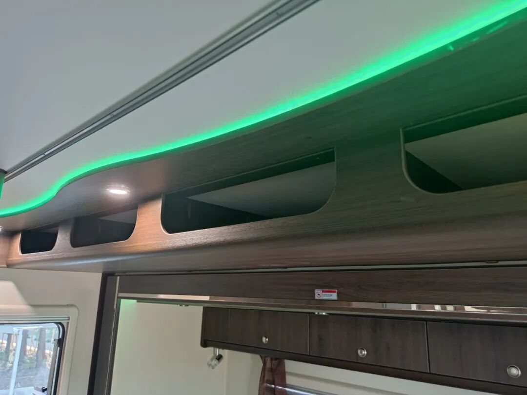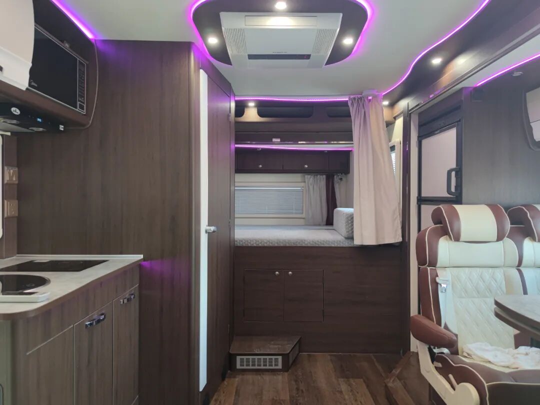后方生活区规划合理,各大功能区互不干扰,基本满足平日起居生活所需;顶部氛围灯带营造氛围感,原木色的家居、内饰,环保、健康,减少异味的同时,也能带来温馨舒适的旅居体验。当然,炎热的天气出行,怎么少得了空调“续命”,除了驾驶舱制冷功率强悍的行车空调以外,这款车在生活区还设有行驻车两用顶置空调,让你在炎热的夏天,也能与凉爽同行。