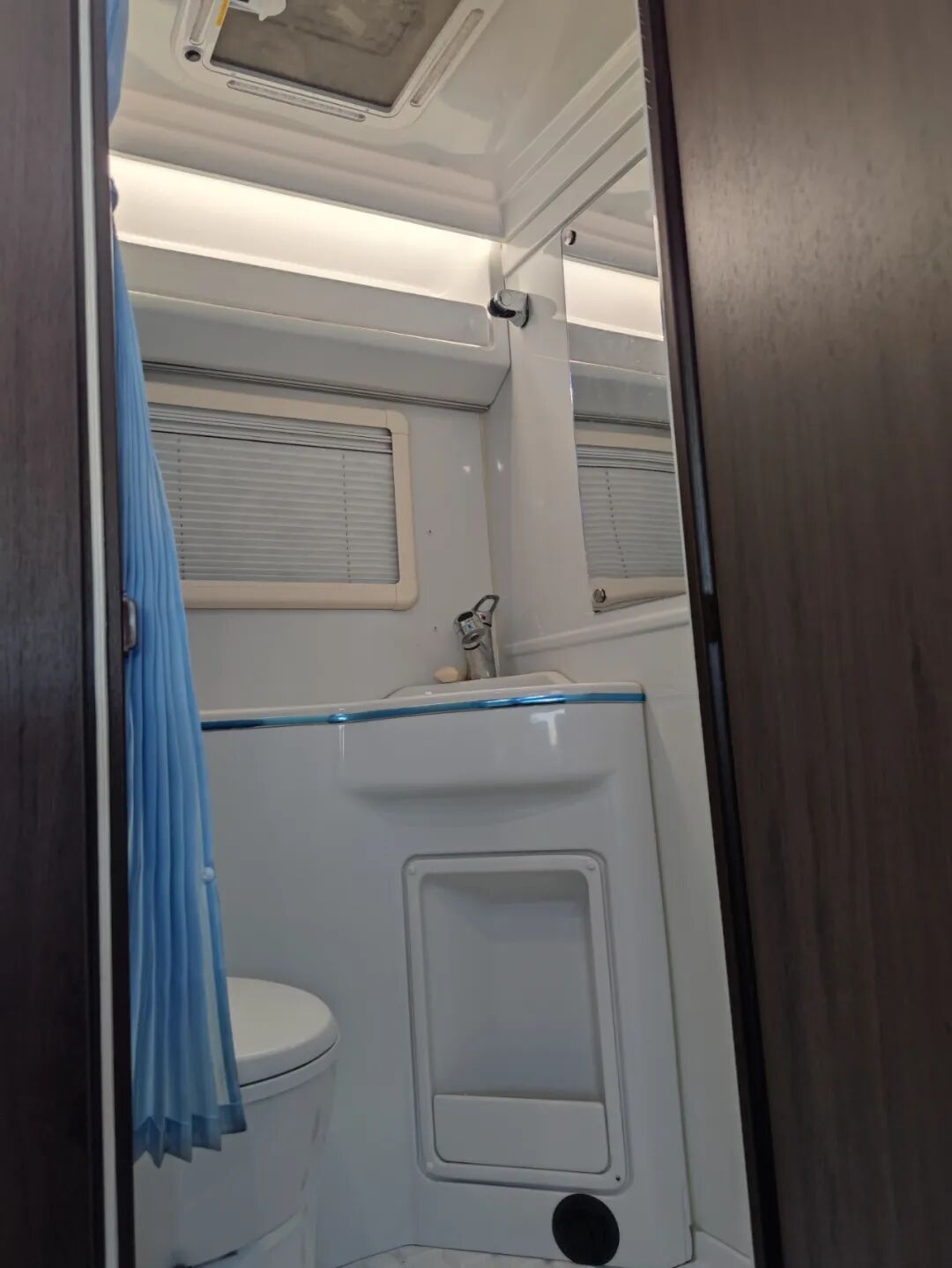 独立卫浴间干湿一体式设计,内部配有赛特福德固定盒式马桶、洗漱池、梳妆镜、浴帘、淋浴花洒等,方便车上人员卫生、盥洗;顶部双气流换气扇加强通风,侧方还有带隔断帘的外推窗。