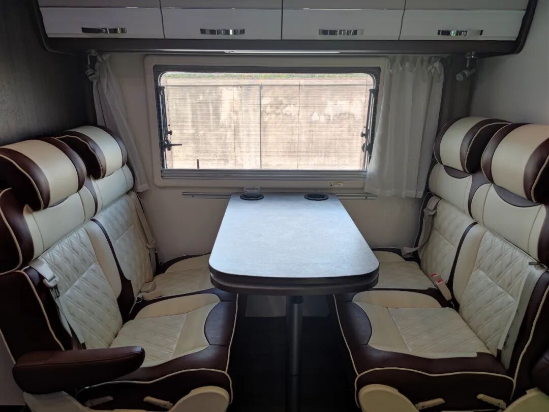 会客区双人对卡座位于车身左侧拓展舱内,驻车时可与拓展机构一同拓出,为生活区带来更充足的空间;卡座带有安全带便于行车时载人;中间设有可升降的拓展餐桌;而在驻车时,对卡座还能搭配升降桌组成床供临时休息;卡座侧方大推窗加强日常采光通风,顶部还有4个独立储物吊柜,储物空间还是非常丰富的。