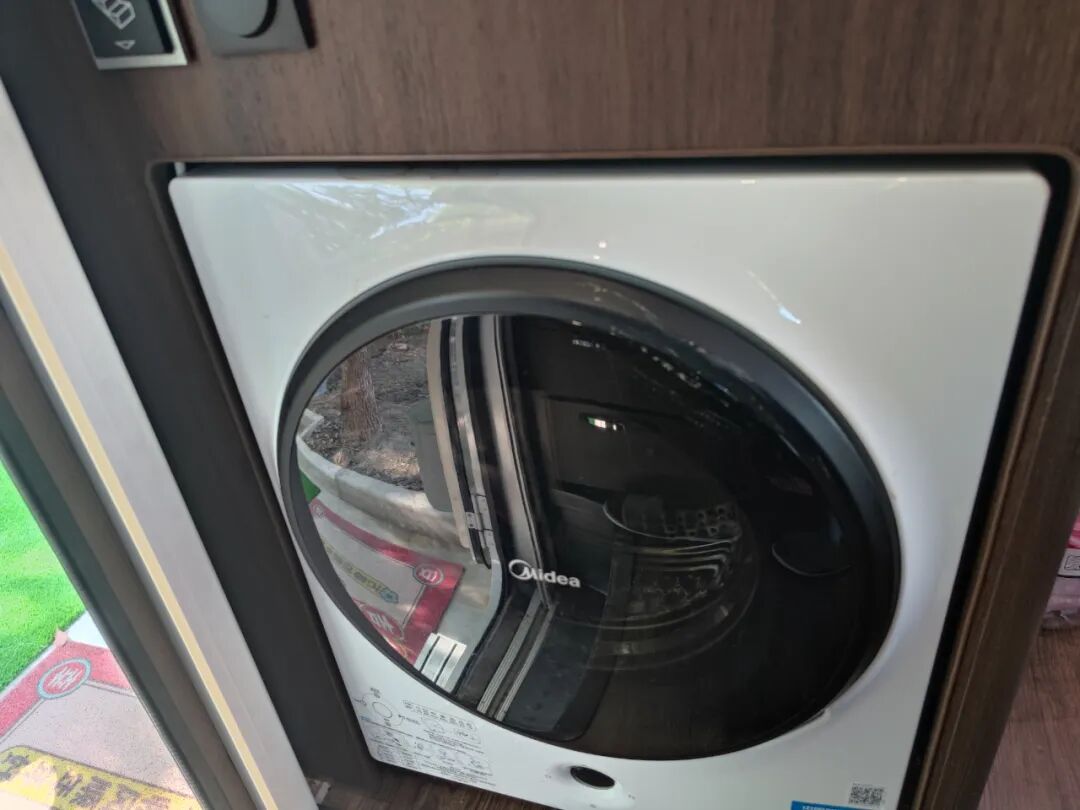 厨房橱柜下方内嵌一台mini滚筒式洗衣机,解放双手,便于旅行途中清洗衣物。