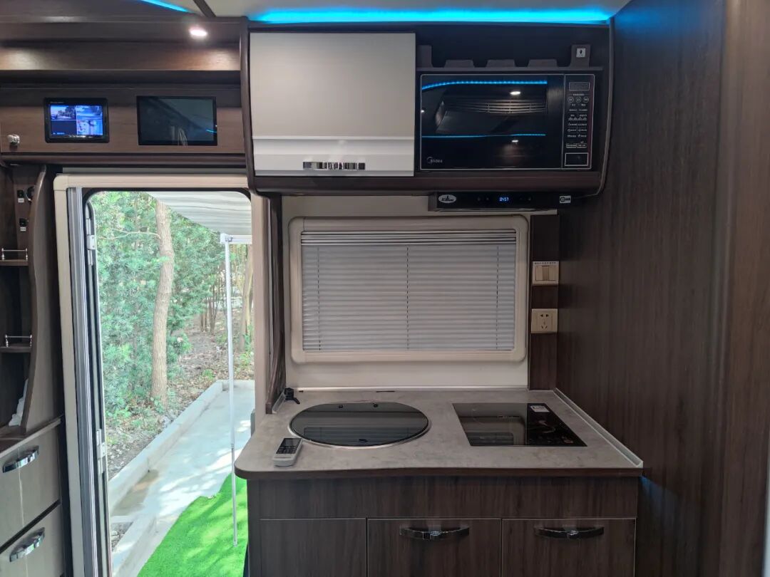 而在相邻的位置设有室内厨房区,配备盖板式洗菜池、电磁炉、微波炉、抽油烟机等,即使遇到阴雨天气,也能满足车内做饭的需求。