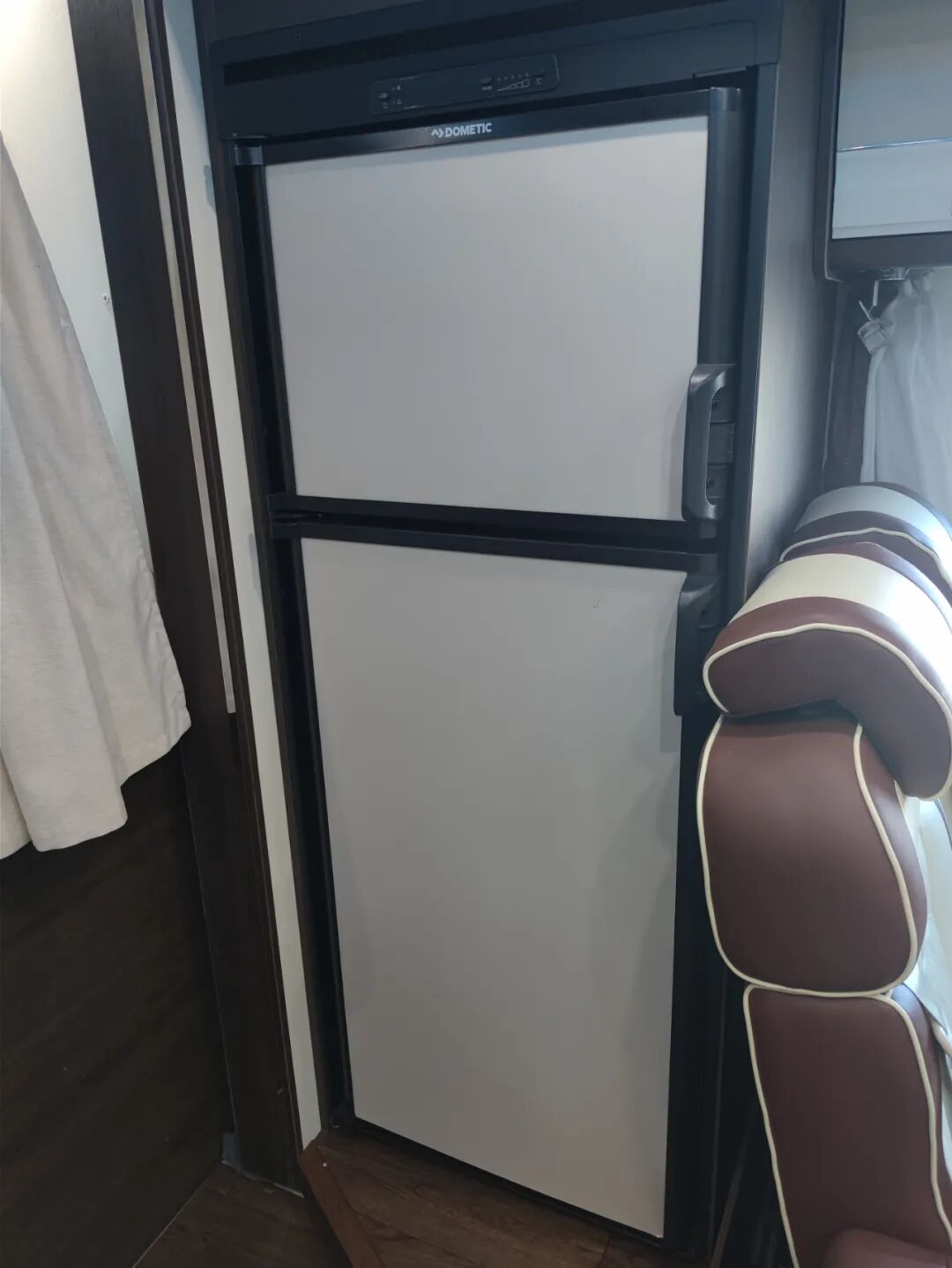 对卡座后方是一台152L赛特福德双开门大冰箱,便于房车旅行途中储存足量的食材、饮料酒水。