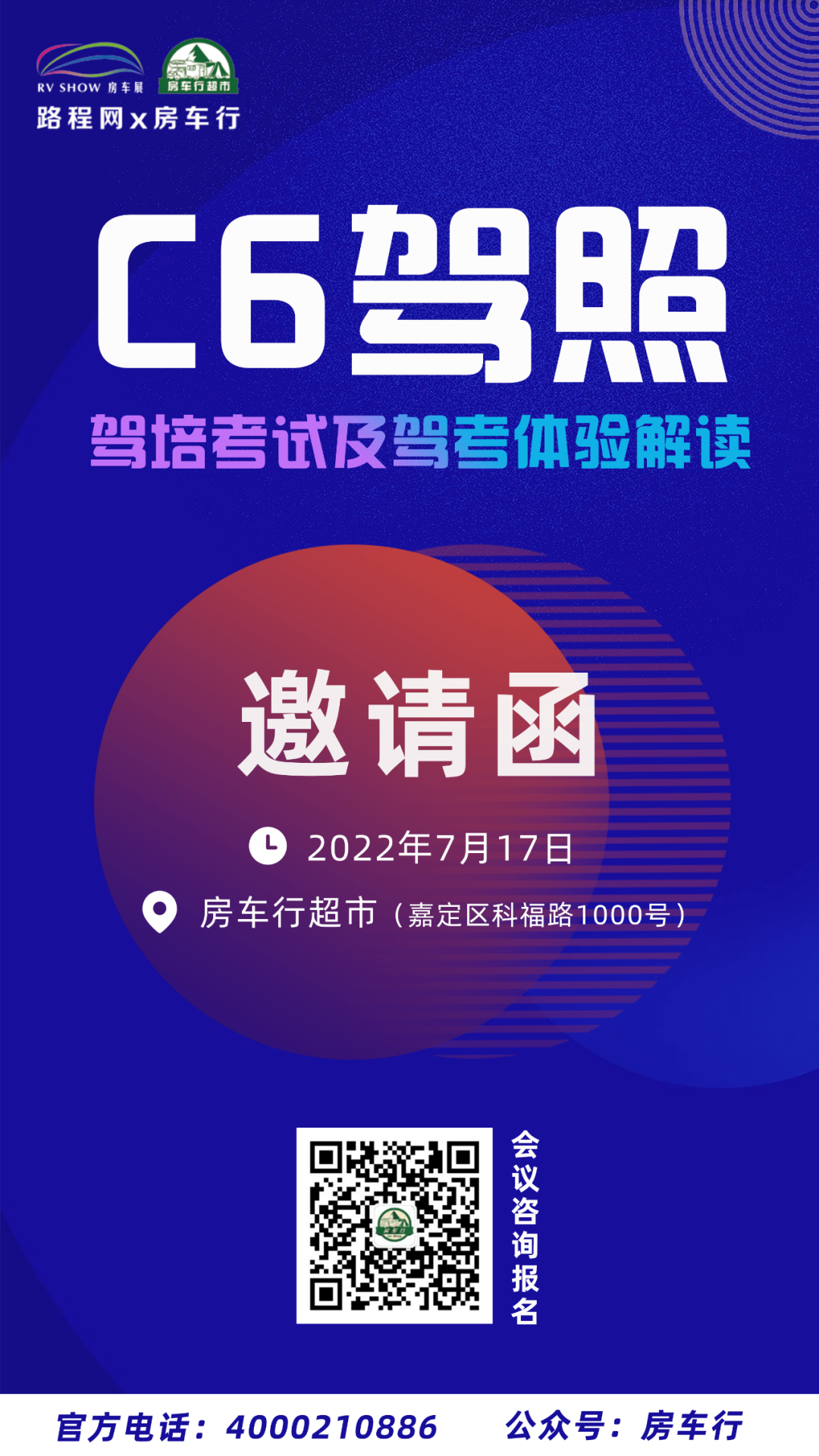 为帮助大家解决关于C6驾照的疑惑,7月17日,路程网x房车行将在房车行超市举办C6驾照驾培考试及驾考体验解读会议,会议拟邀请众多C6驾照相关专业人士与会演讲,欢迎对C6驾照感兴趣的车友前来听会。