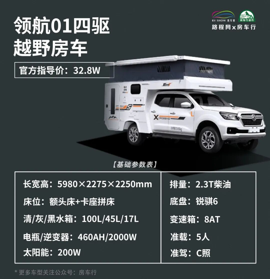 作为一款越野皮卡房车,领航01无论是四驱驱动系统的配置,还是双排驾驶室的设计,都让这款房车竞争力十足,同时它的生活功能设计也非常完善,设置了对向卡座和独立卫生间,车内两张床可以满足3人睡眠休息,适合一家三口外出旅行;价格方面,这款房车的官方指导价32.8W,心动的车友赶快行动吧!