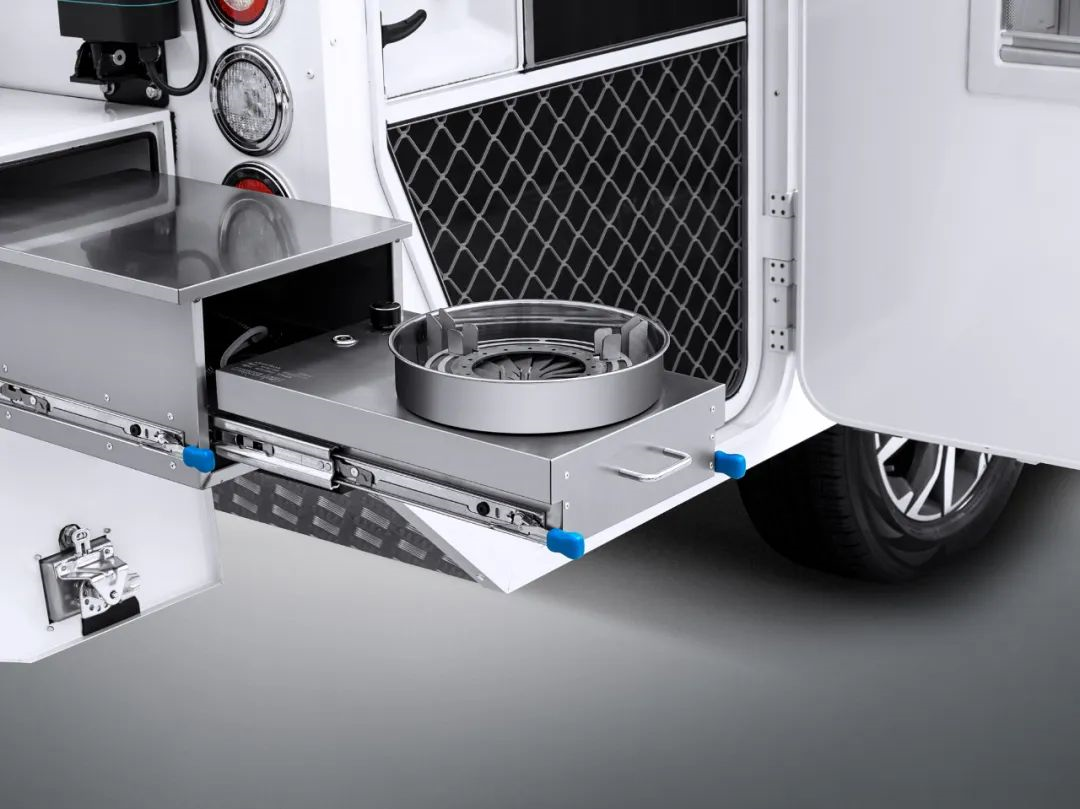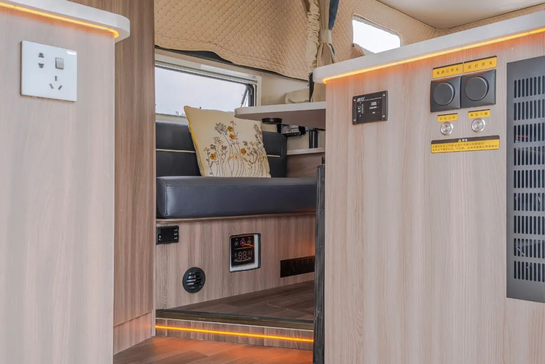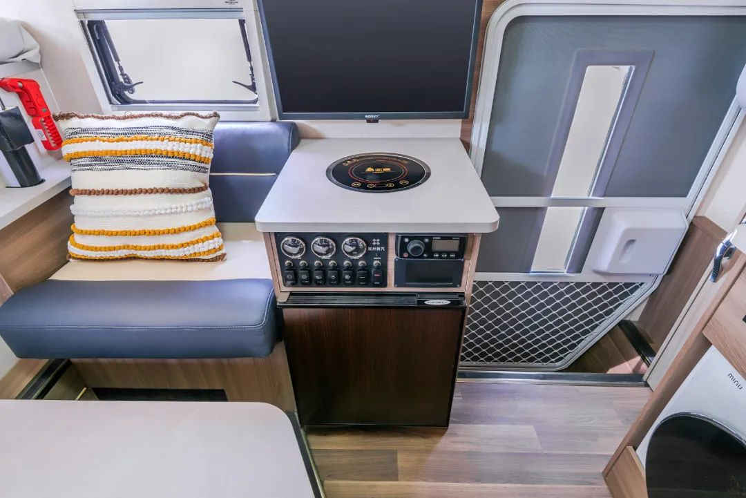 分体设计的厨房区,使用操作更方便,操作台面主要用于处理食材,烹饪台配有1200W电磁炉,是车内主要的烹饪设施,下方是总控制面板和50L车载冰箱;上方还有24寸智能电视、富声车载音响,满足旅行影音娱乐所需。