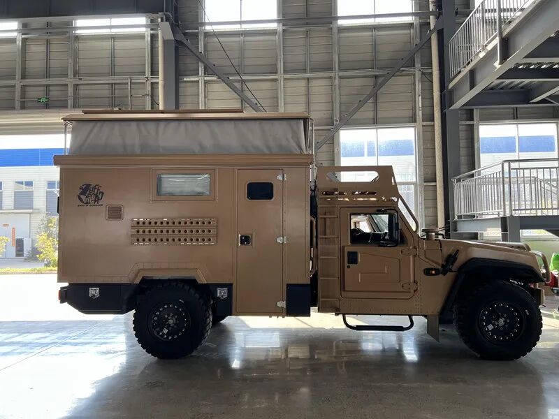 车辆配备卧具、厨具、卫生设施、供配水设施、电器设施等旅居宿营和娱乐的专用装置;不选装顶置空调时车高2750mm;可选装ETC车载装置;选装脱困板、太阳能板、顶置空调;侧防护和后防护为裙边结构;后部裙边最下端离地高400mm。