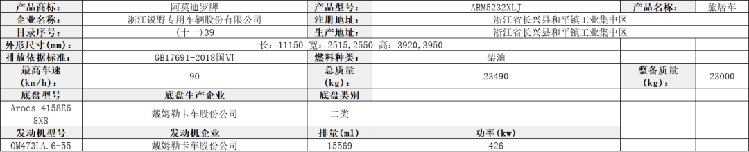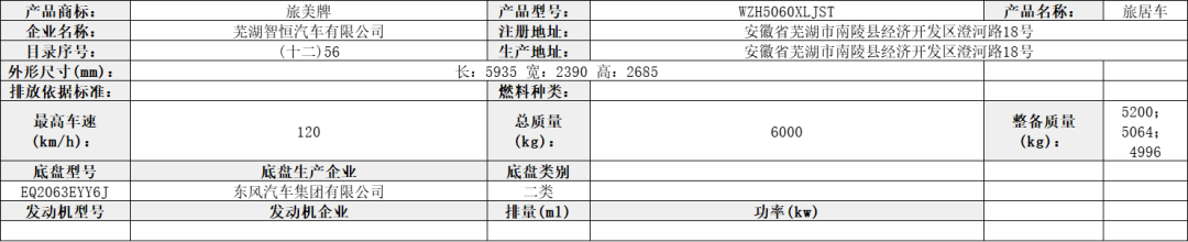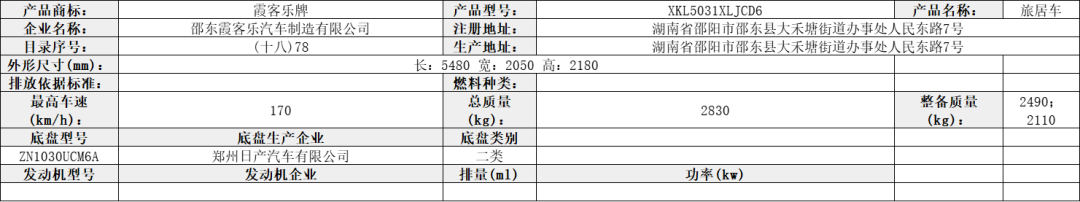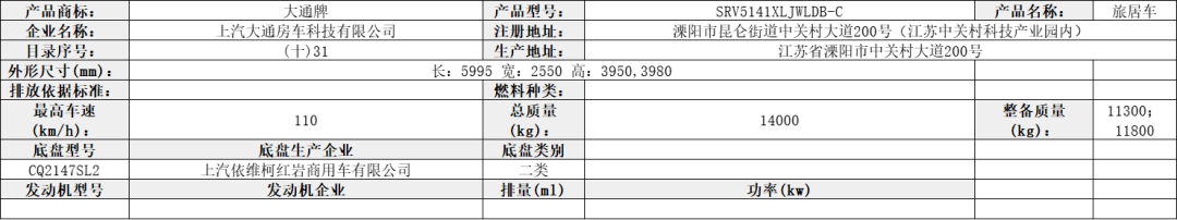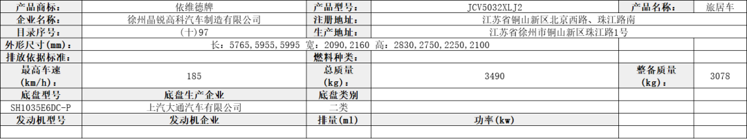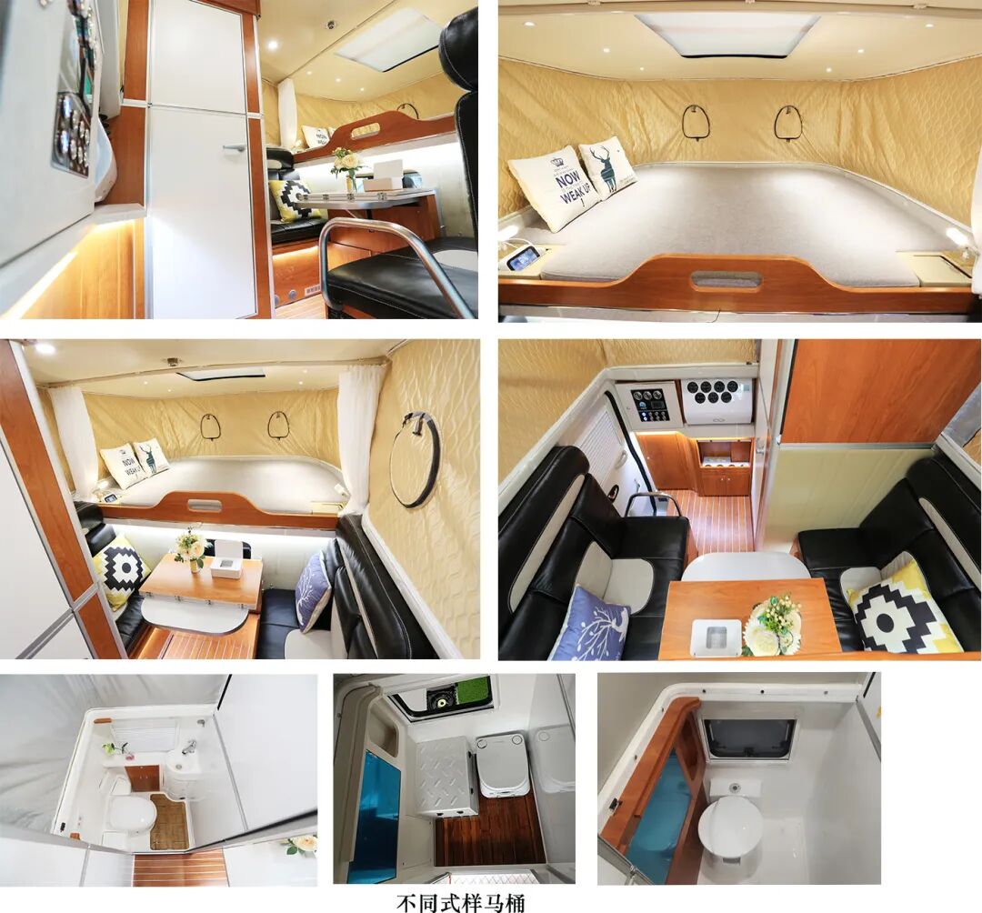 该车装配睡具、卫生设施,报警装置等旅居生活设施;车辆顶部可升起(行驶时顶部收起);随底盘选装不同式样前照灯、前格栅、装饰件、前保险杠、轮眉、轮辋、卡钳;随底盘选装前泊车影像、后牵引装置、侧踏板;选装不同式样马桶;选装后挡玻璃、太阳能板、柴油灶、直接供电式ETC;选装轻质高端内饰(外形不变)对应的整备质量(kg)为:2110。
