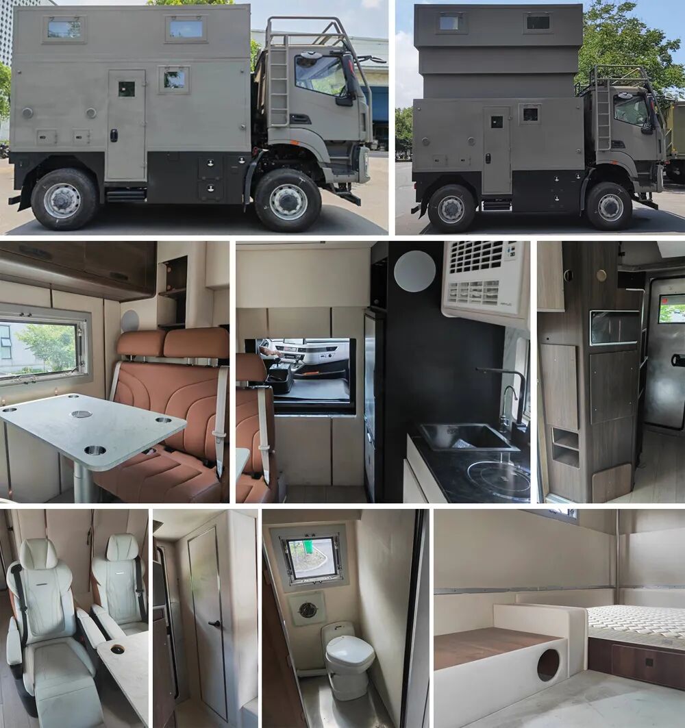 1.本车型装备桌椅、睡具、卫生设施、厨房设施等,用于宿营旅居;2.随底盘选装前后组合灯、后视镜、前轴轮眉结构、驾驶室上车扶手、尾部耦合器连接装置(对应准拖挂车总质量4500kg)、驾驶室外观造型、前下防护装置,随底盘选装425/65R22.5 18PR轮胎时车高为3980mm;3.选装贴花、人脸识别、换气天窗、外置取水口、遮阳棚、外置抽拉式操作台、高度防撞预警系统、投影仪、储物箱、绞盘、驾驶室顶置防滚架及爬梯,内部选装电磁炉、升降床、岛床、新风系统、投影仪。