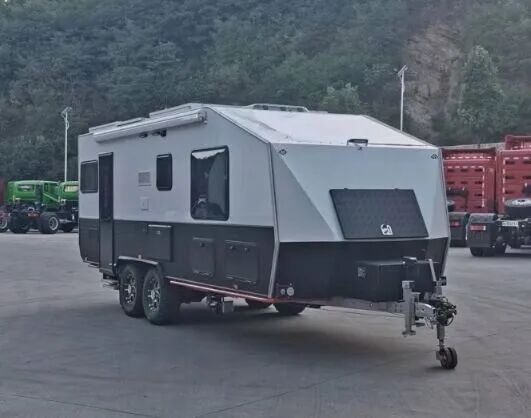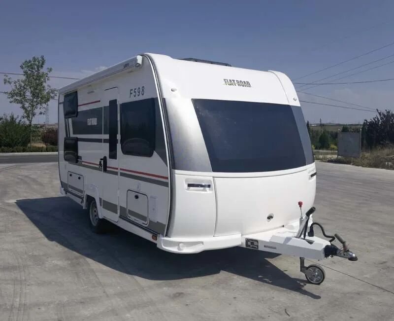 1.车厢顶部封闭,不可开启;2.牵引杆深入量为50mm,连接器最大负荷275kg;3.顶部装有天窗、换气扇、太阳能板;4.厢体内安装有床铺、桌柜、卫生设施,炊事设施及娱乐设施等;5.该车非乘用车,行驶过程中不载人;6.该车辆采用独立弹簧悬架形式。