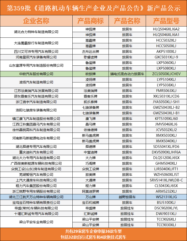 2022年7月13日,国家工业和信息化部在官方网站公示了359批关于《道路机动车辆生产企业及产品公告》(以下简称《公告》)新产品,共有29家房车企业申报36款车型,包括32款自行式房车和4款拖挂式房车。此次公告出现了首款越野旅居车型,另外还有一款新能源房车也非常引人注目。除这两款车型外,上汽大通MAXUS、霞客乐、旅美速腾、阿莫迪罗、法美瑞等知名房车企业都申报了新款车型,途酷神龙大侠也位列其中。