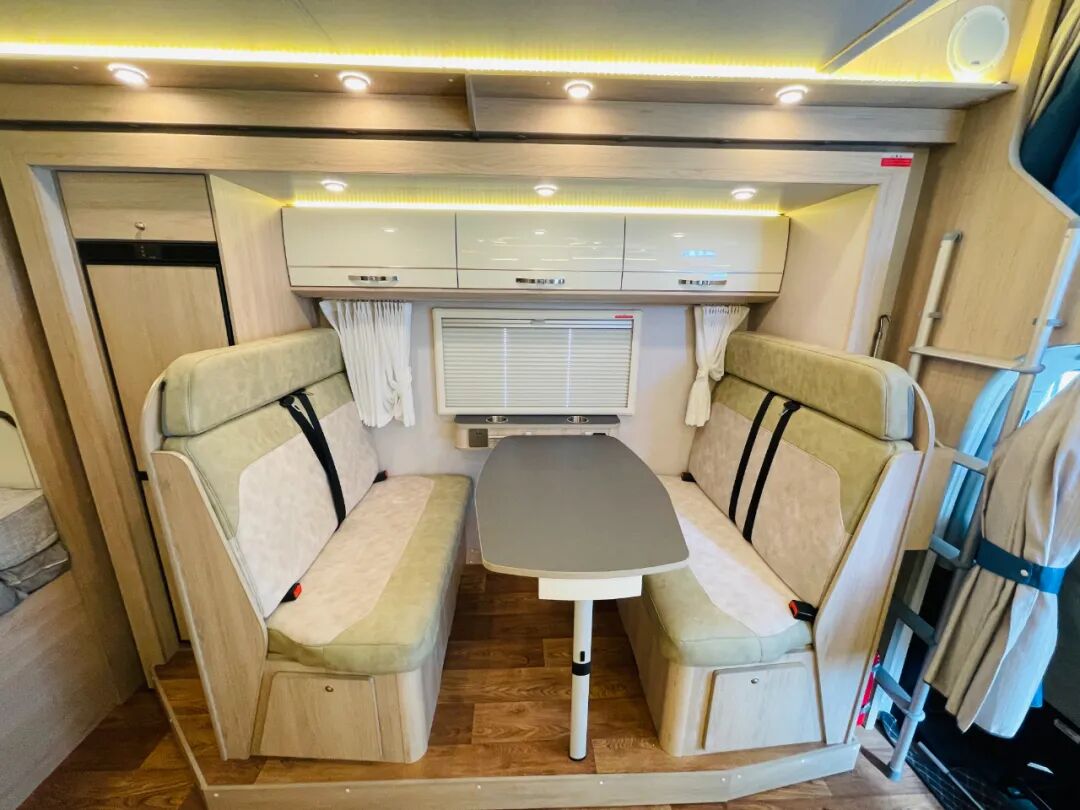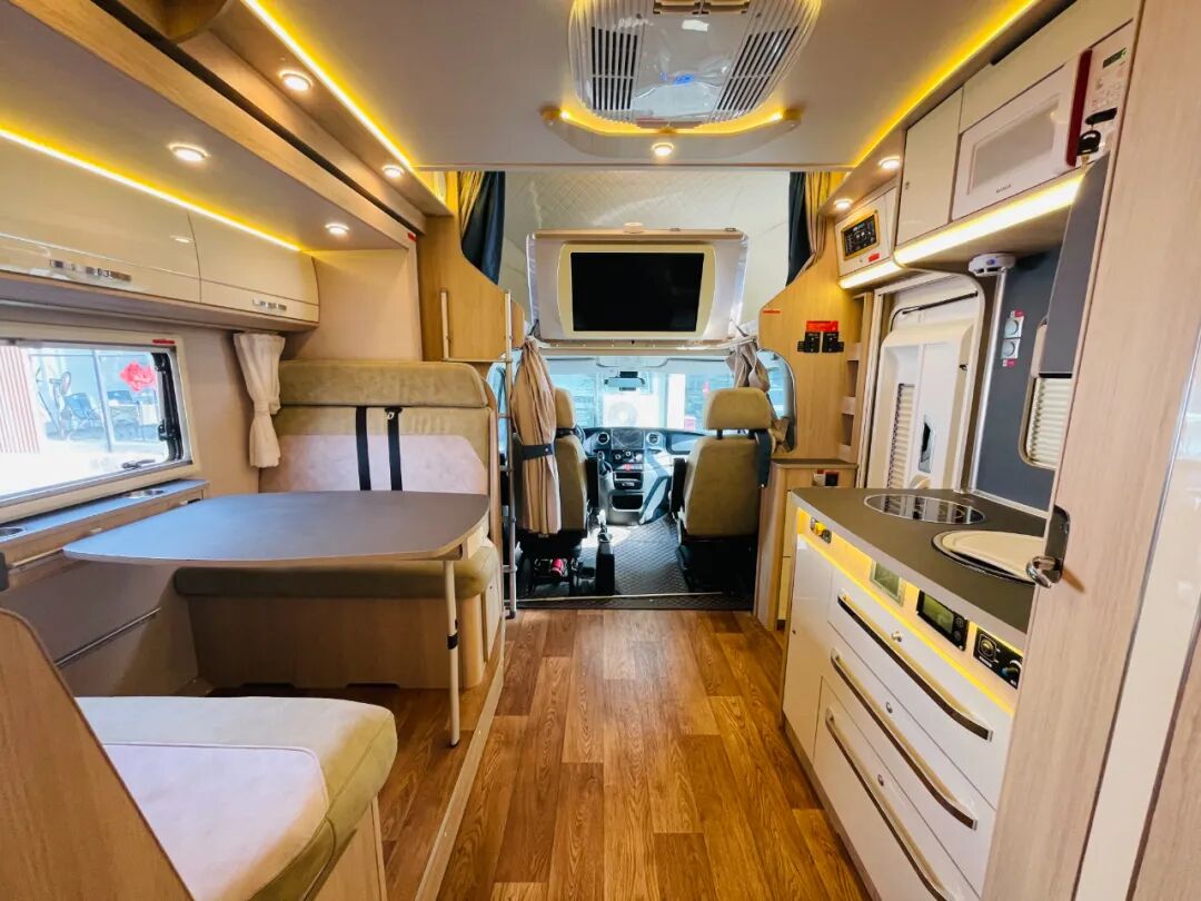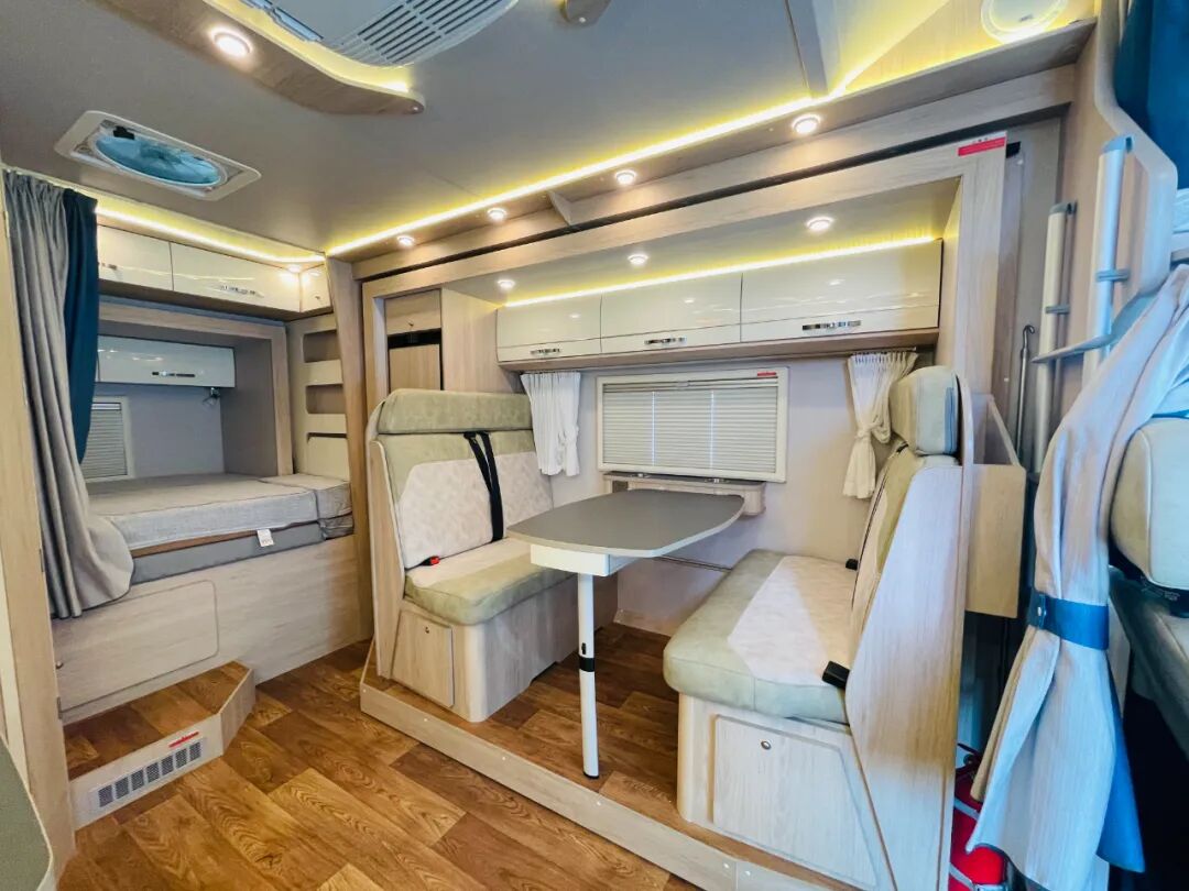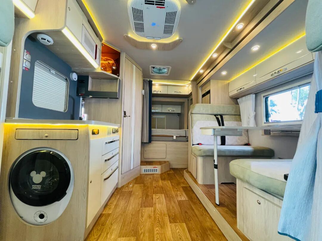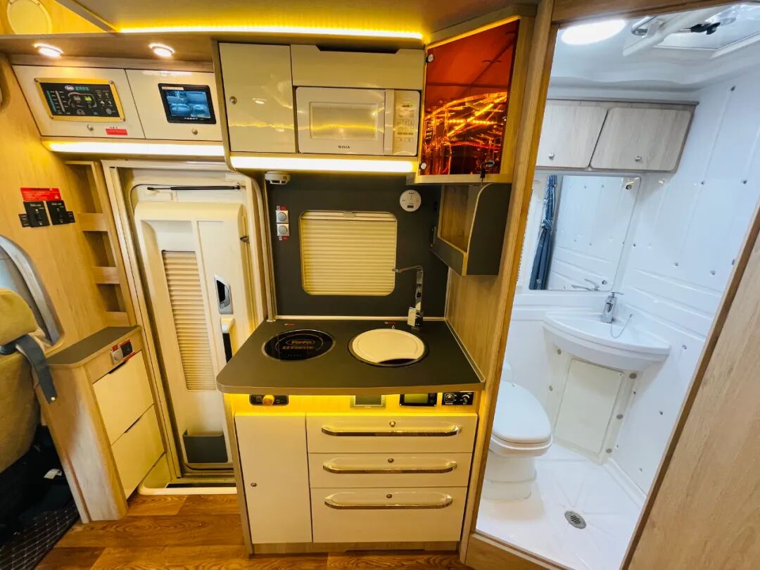 生活区部分原车主并未进行太大的改动,基本和原车保持一致;布局是常见C型房车的经典布局,各大功能区错落有致、互不干扰;同时得益于双拓展机构的存在,驻车后车内非常宽阔、通透、明亮,较大的生活空间带来极为舒适的旅居享受,顶部氛围灯、车内轻型木质家具搭配底部实木地板,也能营造温馨的生活氛围。