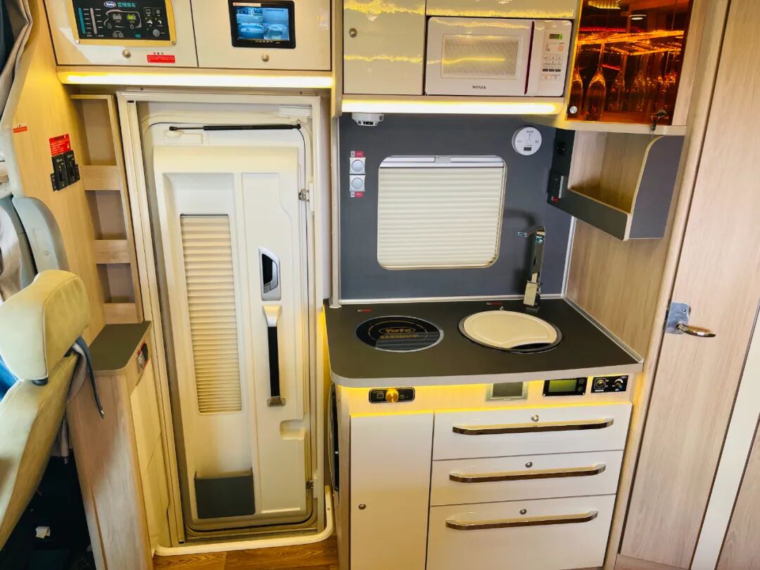 乘客门进门左手处便是车内厨房的位置,一体式橱柜设计,下方设有电磁炉、盖板式洗菜池、水龙头、储物柜、电源插座、电器控制开关等,上方搭载微波炉、酒柜、储物柜等;橱柜下方还内嵌一台迷你洗衣机。