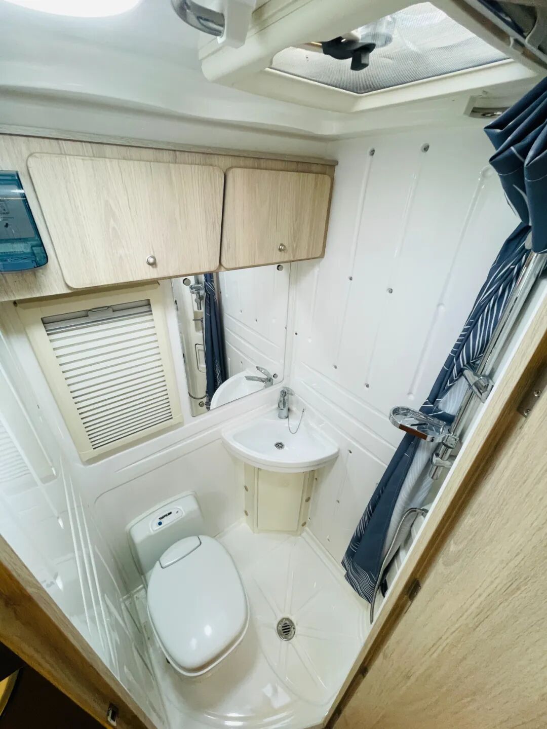 厨房相邻的位置便是独立卫浴间,整体吸塑式设计,便于清洁打理;内部设有固定马桶、洗漱池、浴镜、浴帘、储物柜、独立淋浴花洒等;侧方外推窗搭配顶部MAX换气扇加强内部空气流通,有效避免异味产生。