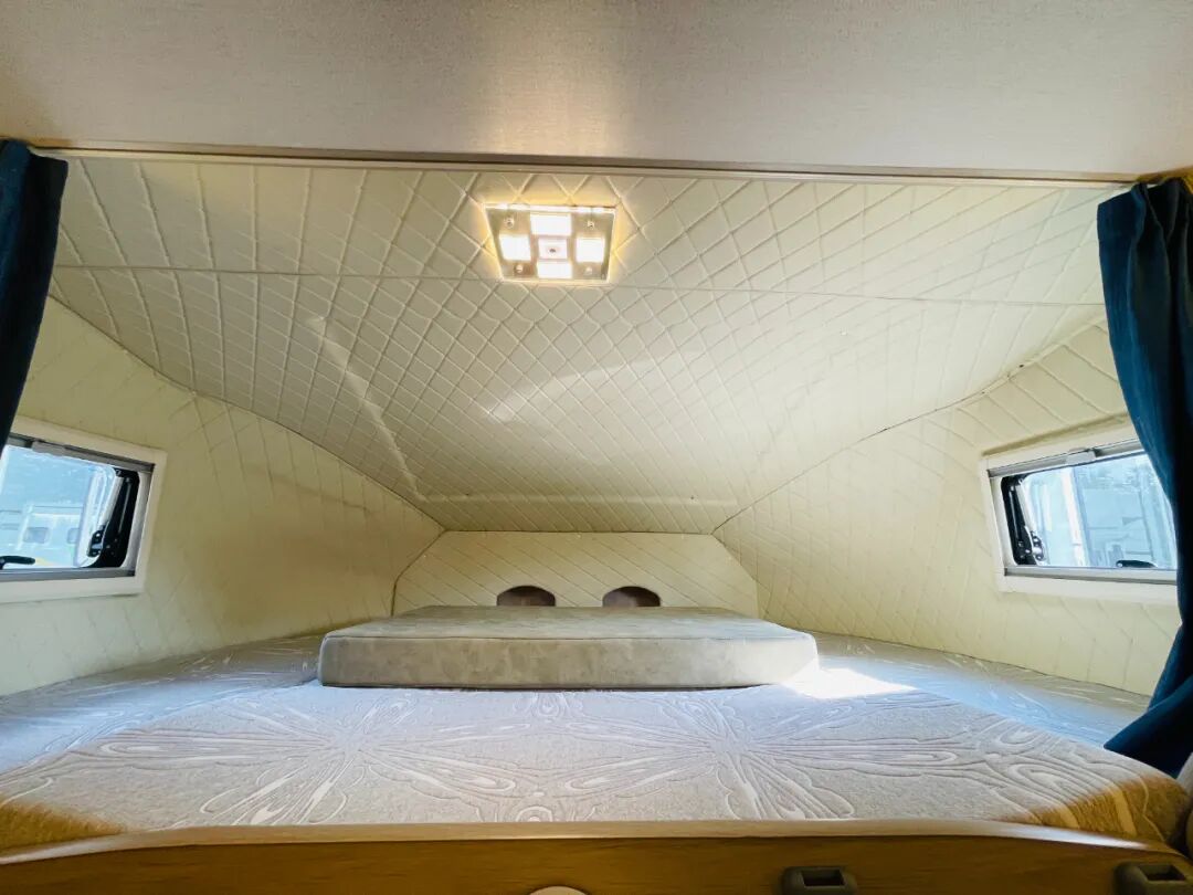 尾置横床铺设柔软床垫,在驻车拓展后,内部空间可轻松满足两名成年人睡眠,内部设有储物吊柜(双层)、储物格、大尺寸外推窗、阅读灯、电源插座等方便日常使用;隔断窗帘以及外推窗自带的隐私帘可以有效保护休息人员的隐私。