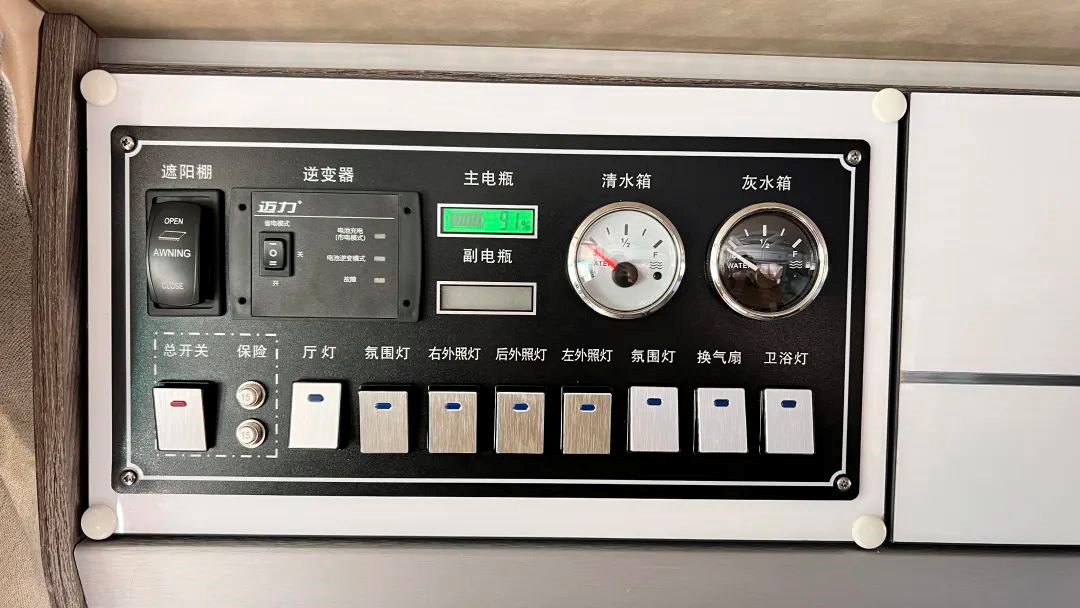 水电控制系统集中设置在一个面板,实时显示电路系统、水路系统的用水用电情况,为控制水电提供便利,另外还有车内照明灯光、遮阳蓬、逆变器等开关。