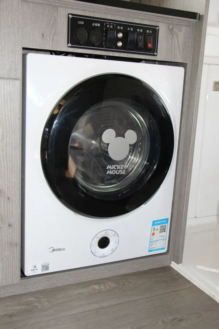 橱柜下方内嵌有一台滚筒式洗衣机,解决户外洗衣的问题,另外还有USB接口、暖风系统等控制开关。