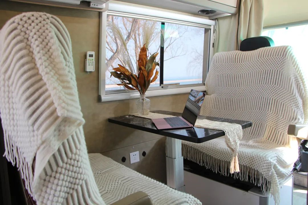 会客区设置了对向沙发卡座,可容纳4人乘坐休息,卡座中间是可升降桌,休息时与卡座可以拼成1900x900mm单人床;侧面配备了电源插座、车窗,解决日常通风、电子产品充电的问题。