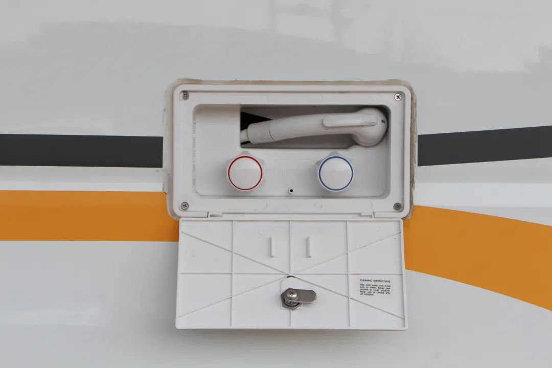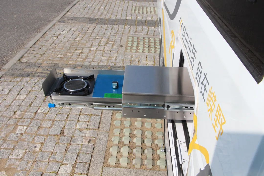 车身外侧配备了齐全的户外生活设施,包括户外遮阳蓬、抽拉式煤气灶、抽拉式花洒、注水口、外接水口、外接电口、户外照明灯等,为户外生活带来更多便利。