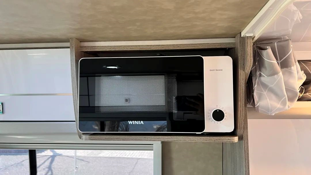 顶部设有吊柜方便收纳厨房物品,侧面还配有微波炉,可以快速加热食物。