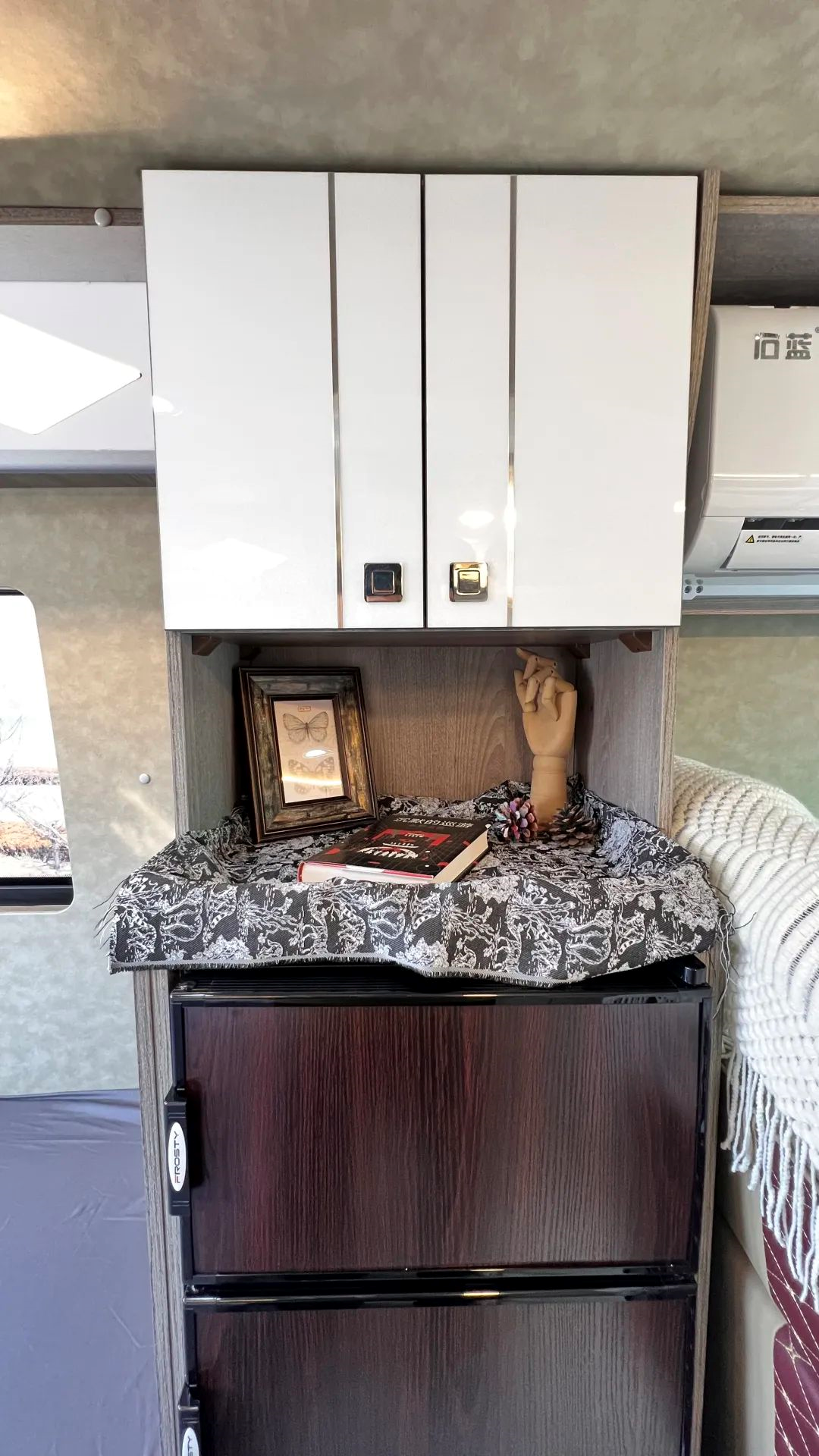 卡座后方设有立柜,上方是双开门的储物空间,下方内嵌有85L房车专用冰箱,用于储存旅行所需食材。