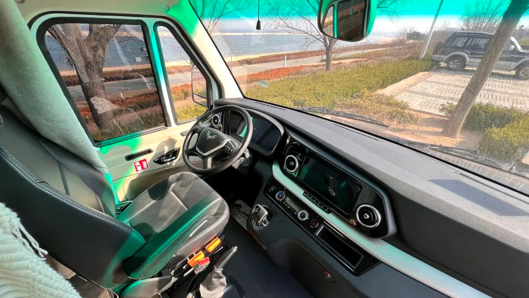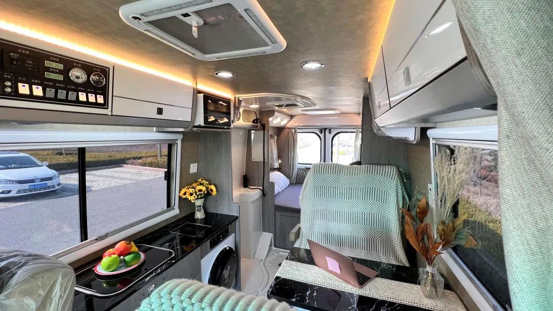 驾驶室后方是整车的生活空间,内部高度1.8米,居住不会感到压抑;内饰采用轻质环保组合家具,搭配室内照明灯、氛围灯,打造温馨舒适的生活空间;冷暖风系统配备了变频空调、暖风系统等,保证车内温度适宜。