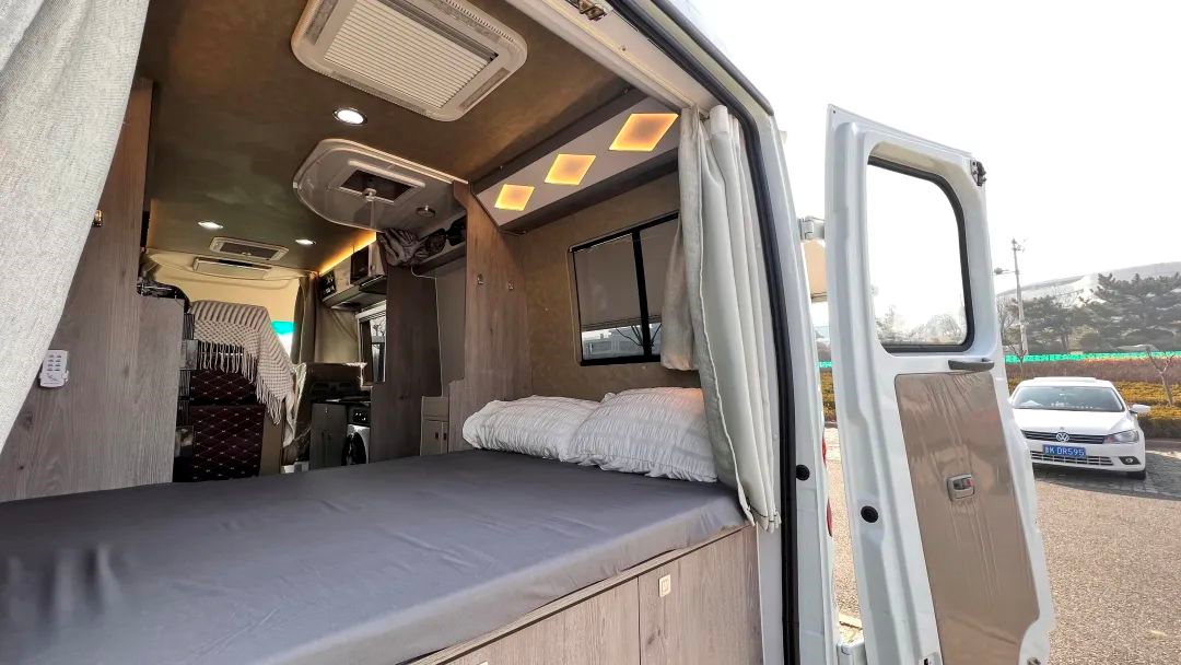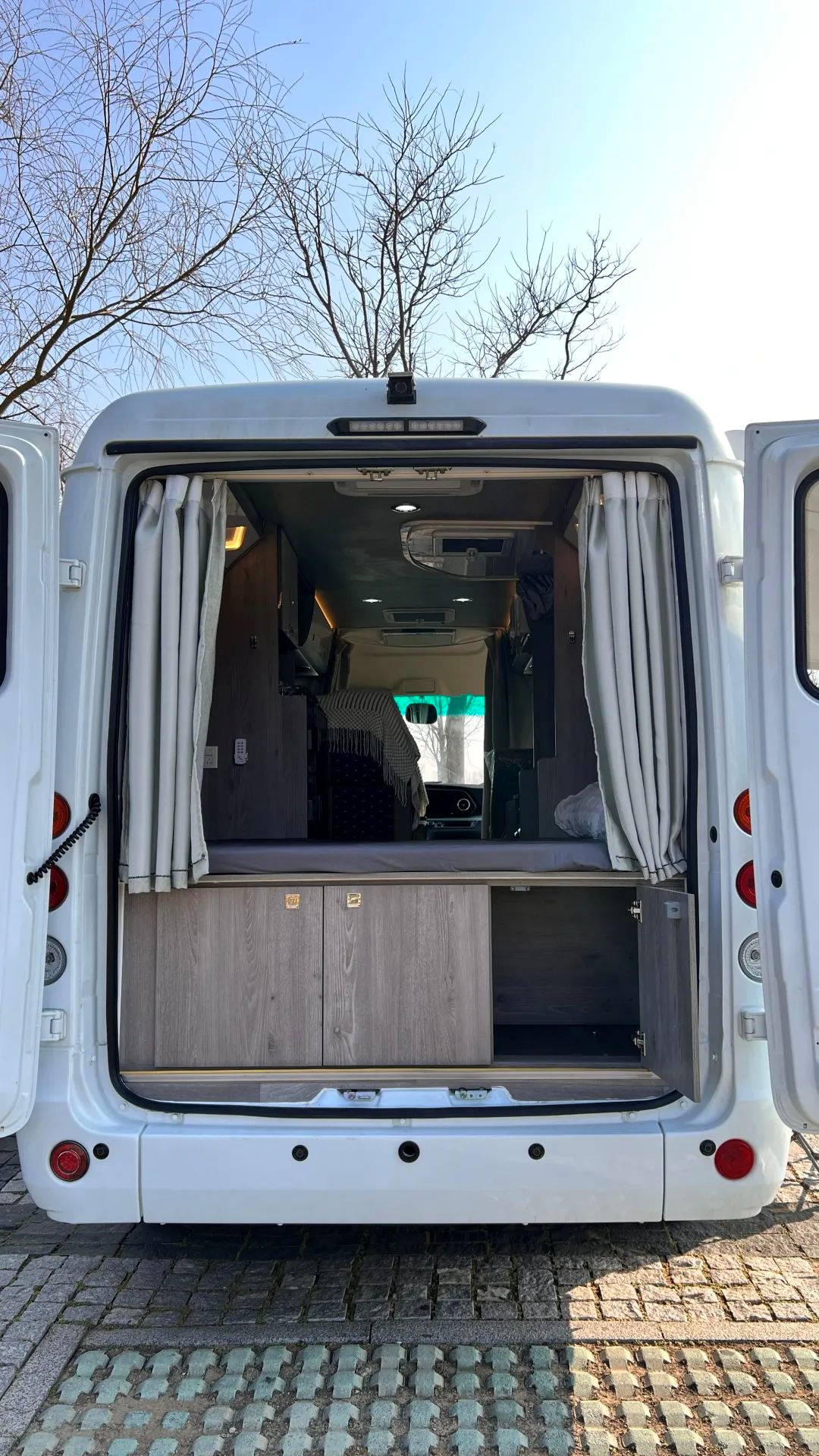 车尾双开门的设计,可以完全打开,方便驻车后从后方上下,也可以快速更新车内的空气;车尾的床铺下方设置了超大储物空间,足以收纳旅行大件物品。