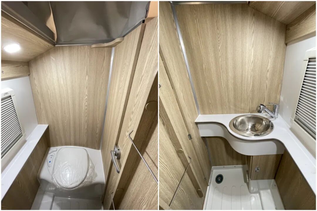 厨房对面,紧靠冰箱的位置是车内的独立卫浴间,隔断式设计,防止洗澡时溅出的水珠、异味等进入生活区,让旅居生活更舒心。