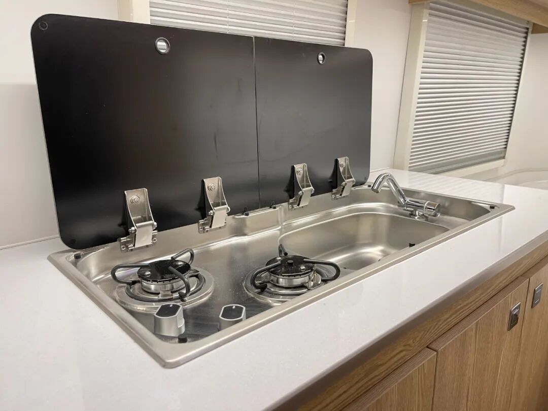车内厨房的柜台和尾床紧挨着,大尺寸操作台面上设有集成式灶台,包含两个灶眼、洗菜池、水龙头,盖板隐藏式的设计,在不使用时便于放置杂物;柜台上下两方设有多个储物空间,方便厨具、餐具的收纳。