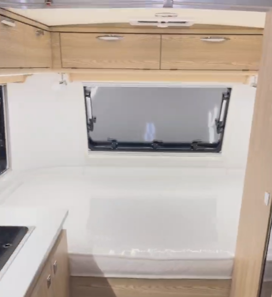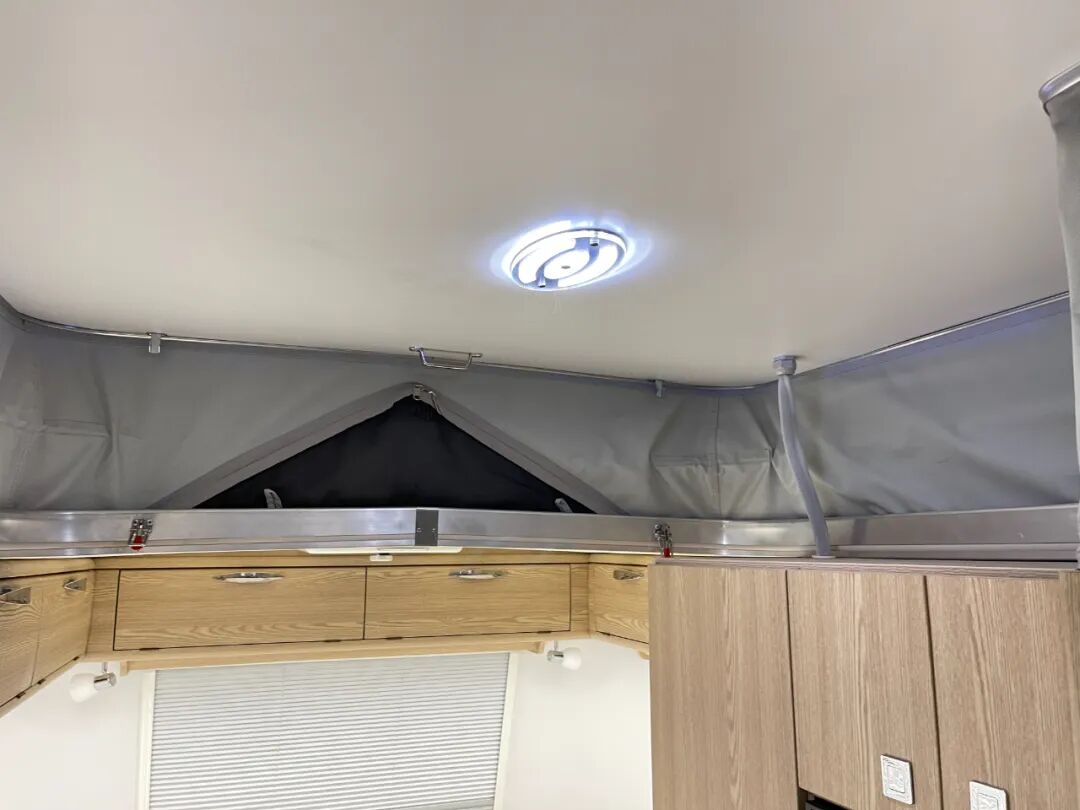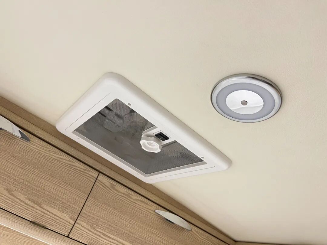 尾床上方设有多组储物吊柜,加强旅居收纳能力,吊柜下方还有阅读灯方便夜间照明,顶部换气扇进一步加强车内空气循环。
