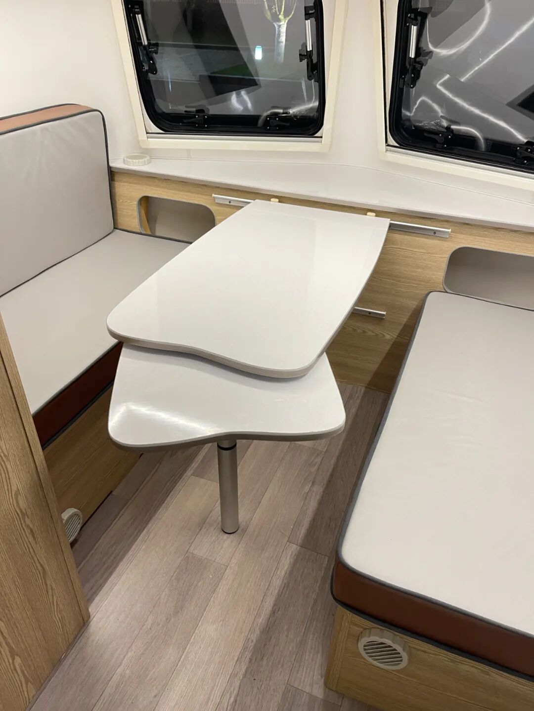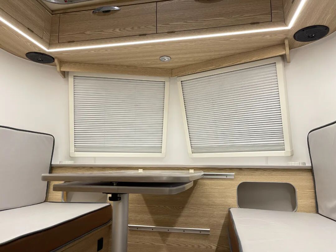 生活区前部是会客区,双人对卡座+餐桌的设计,餐桌选用双层旋转支腿,底部隐藏小桌板,拓展后进一步增加桌面尺寸;侧方设有储物格、置物台便于放置杂物,两个大推窗加强日常采光通风。