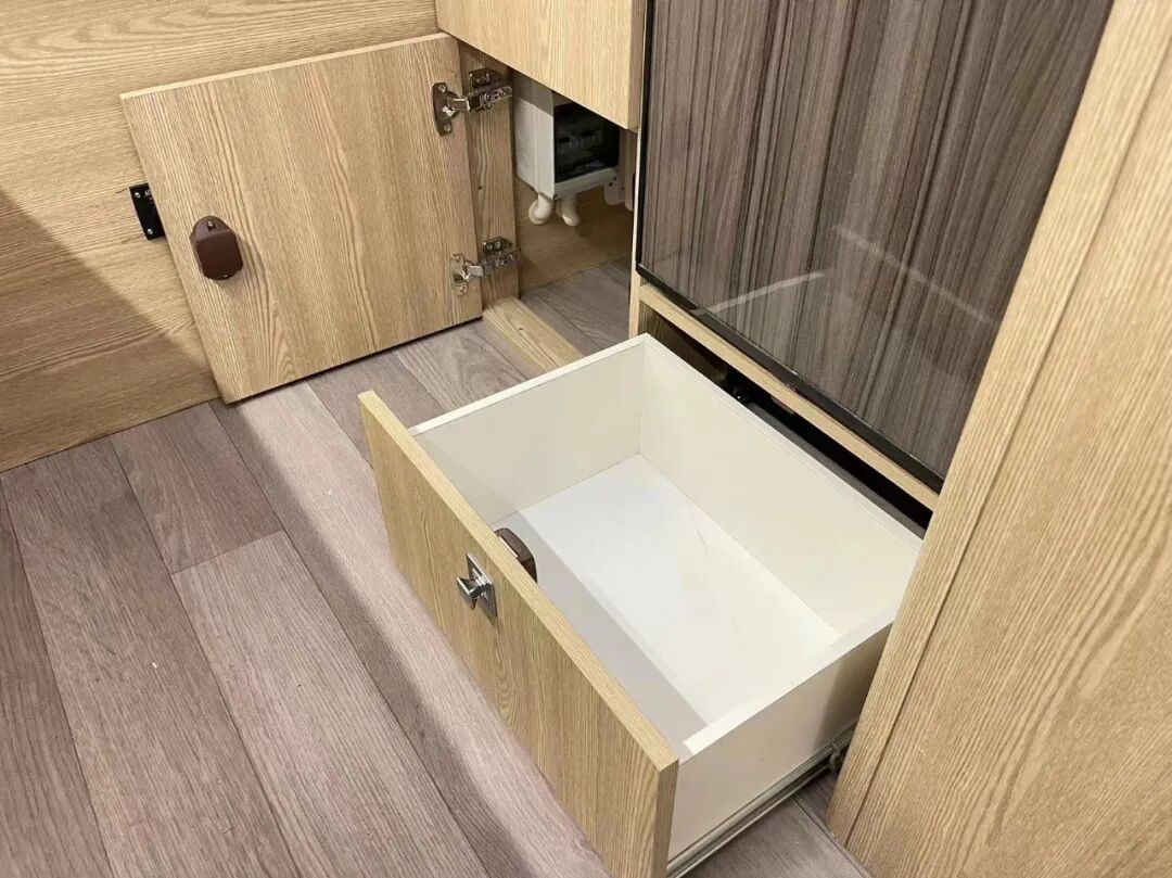 相邻位置还有一台弗罗斯特118L冰箱便于储存食材、冷藏酒水;冰箱底部、侧方还有抽屉、衣柜进一步丰富车内储物空间。