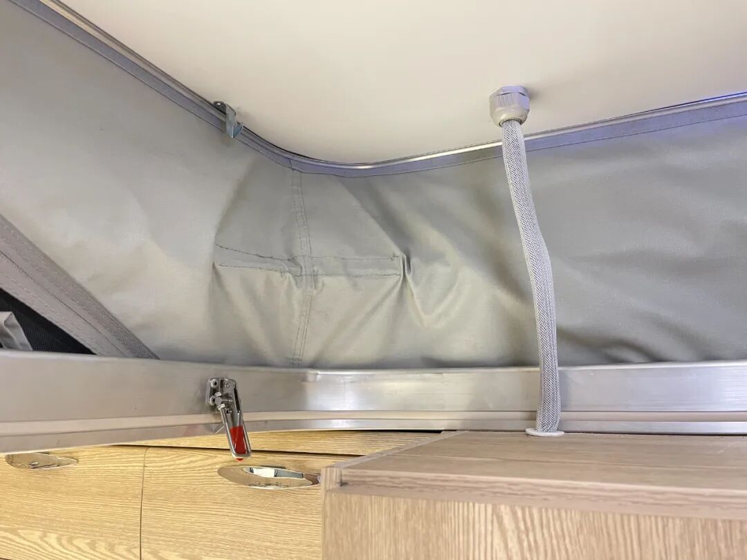 升顶结构采用铝型材质并喷涂银灰色,篷布经过加强处理,保温、安全性会有不错的保障;驻车时打开升顶结构,车内空间大幅增加。