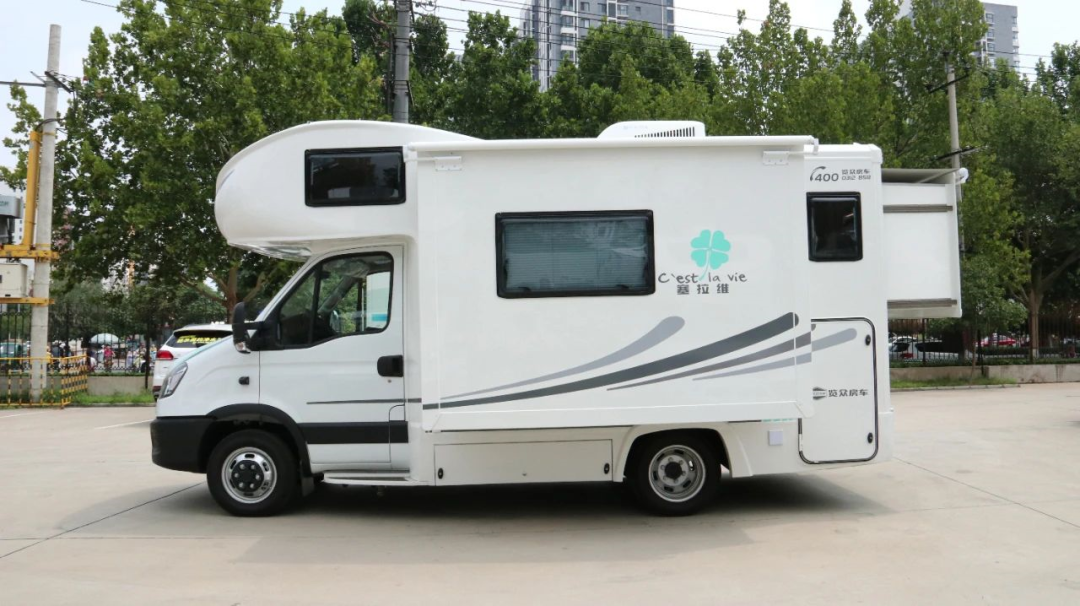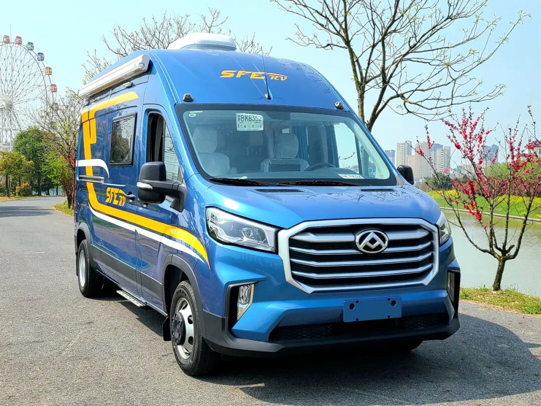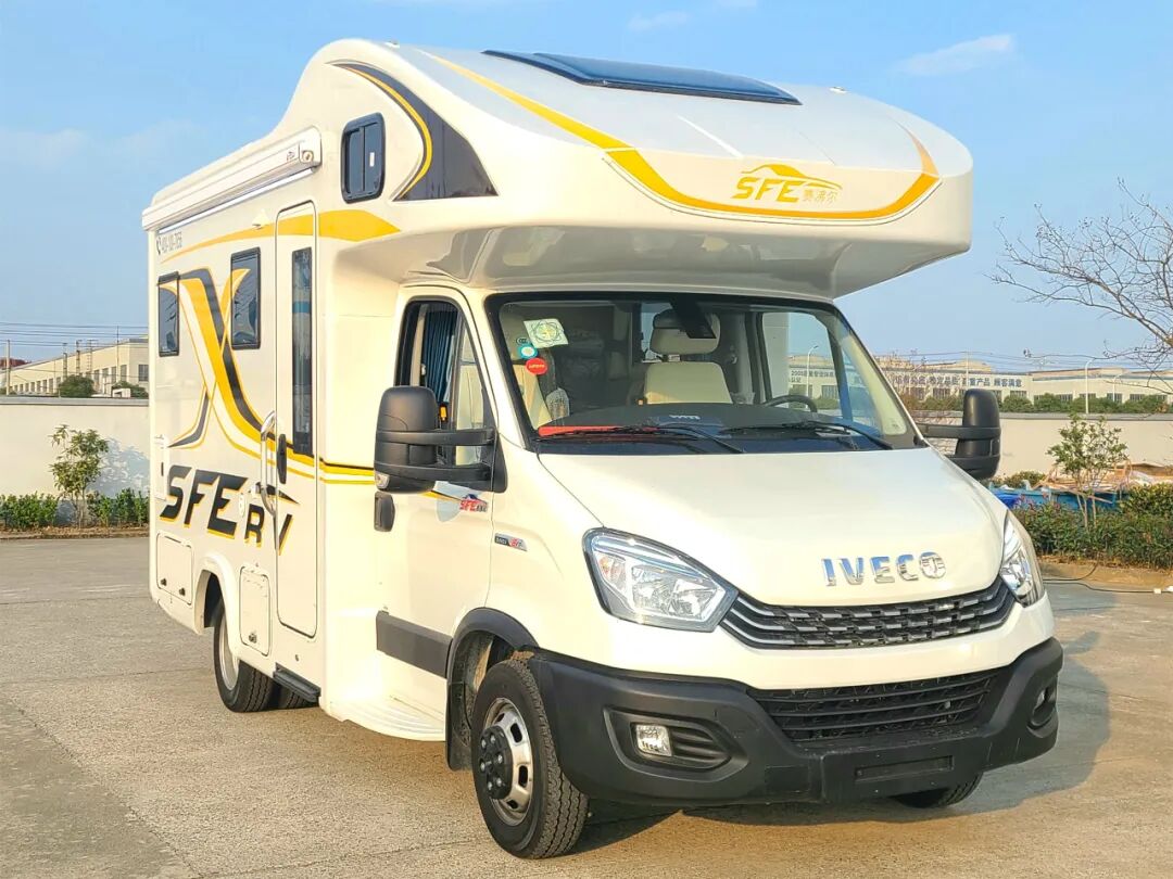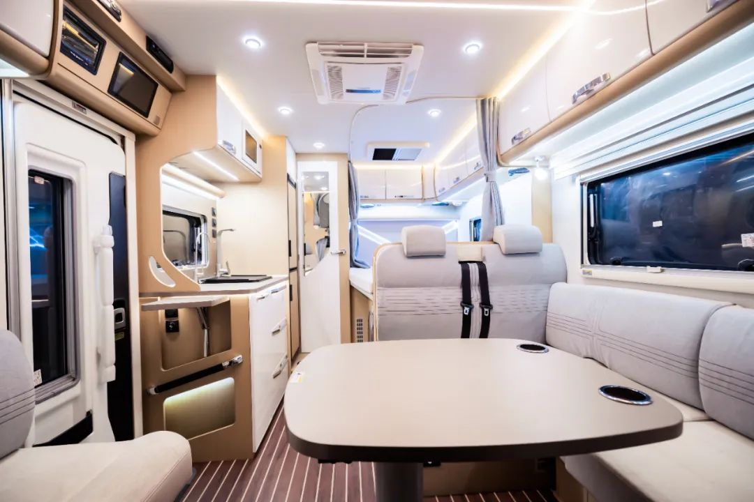 依维柯底盘打造,双拓展舱设计,拓展后拥有更大的车内空间;车身外尺寸5995x2300x3200mm,轴距3300mm,核载6人,满足蓝牌C照可驾驶的要求。