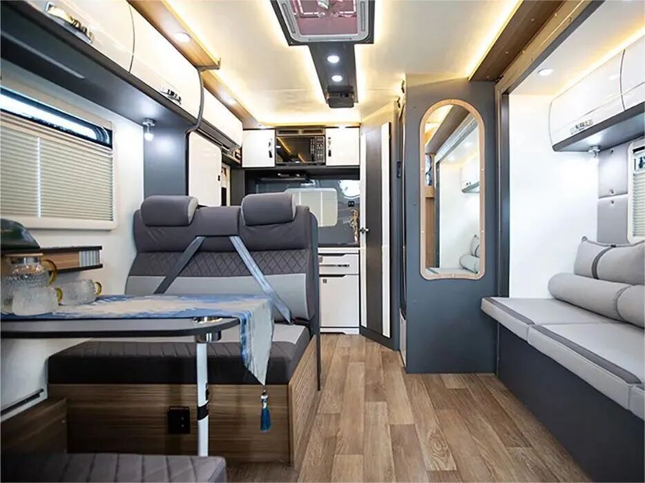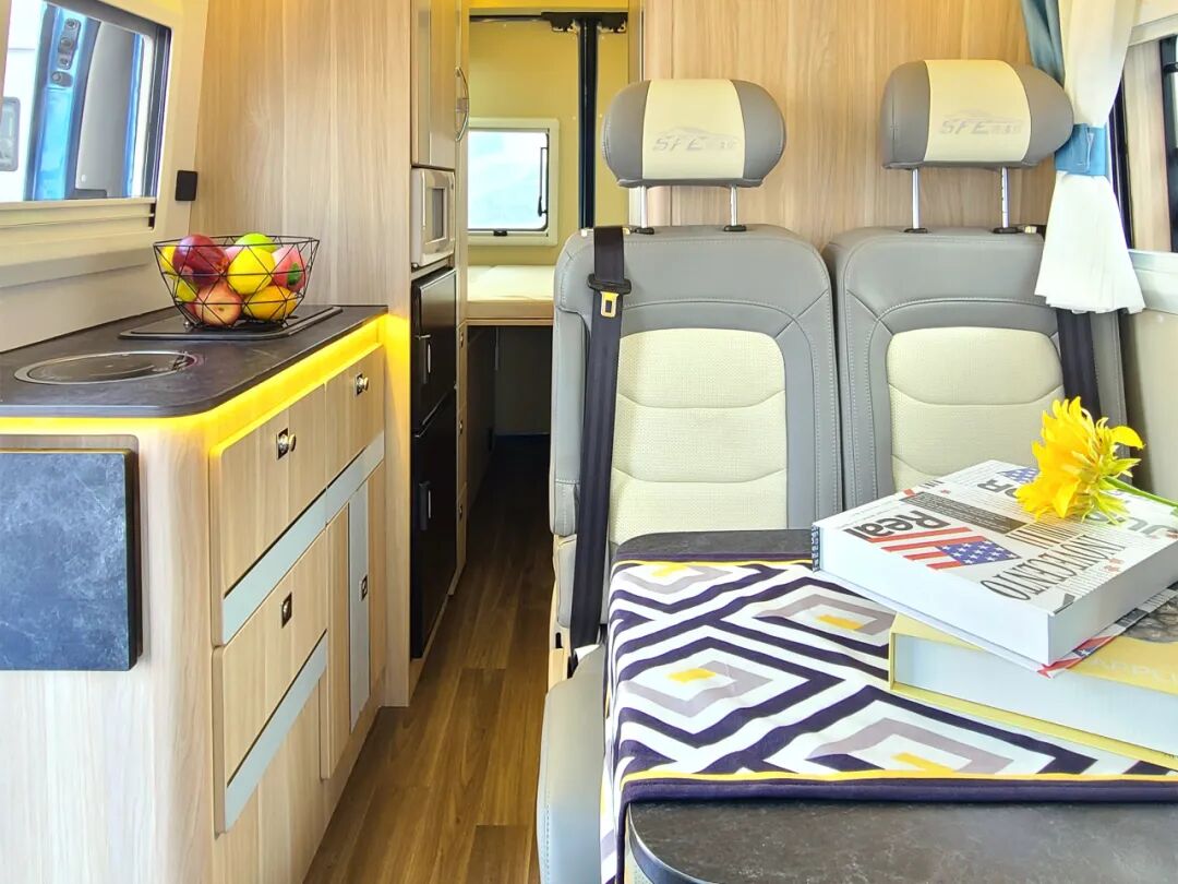 简约家具内饰设计,色彩层次清晰,居住温馨;额头床拓展后尺寸为1700x1950mm,对坐沙发可拼成1700x900mm床铺,休息空间丰富;水电配备150L净水箱、50L灰水箱、460AH锂电、300W太阳能电池等。