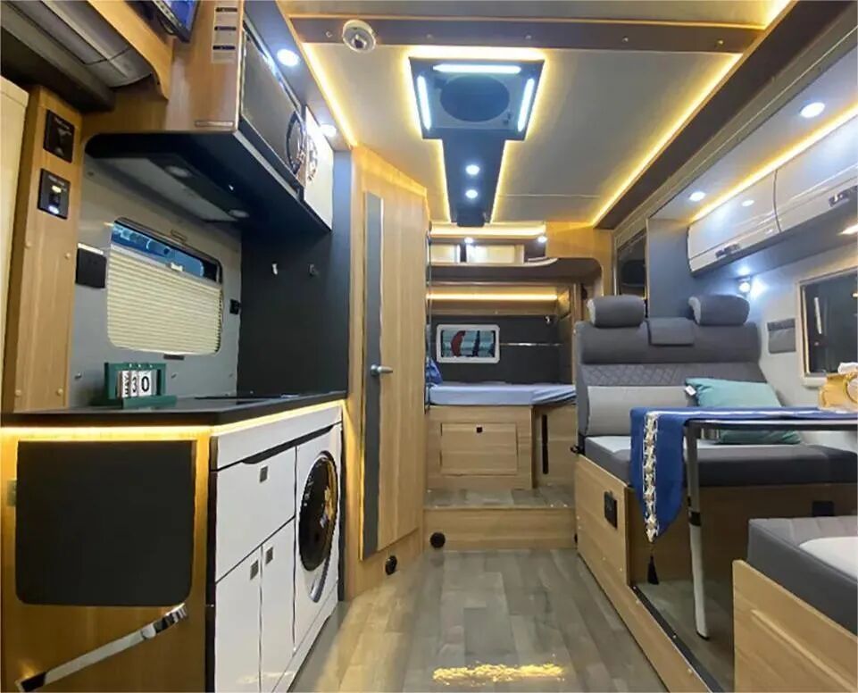 经典内饰布局,前后共设置两张大尺寸横床,卡座也可拼床,整体睡眠空间丰富;水电配备210L净水箱、60L灰水箱、100AH电池、3000W逆变器等,可选400-800W锂电和太阳能电池板。