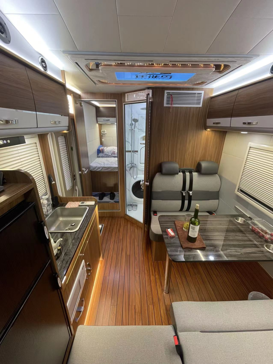 内饰采用实木复古家具,结实耐用,健康环保,搭配顶部吸顶灯、氛围灯、LED射灯照明,打造典雅温馨的生活空间;水电配备了200L净水箱、70L灰水箱、28L热水器、824AH锂电、3000W逆变器、880W太阳能等,水电续航充足。
