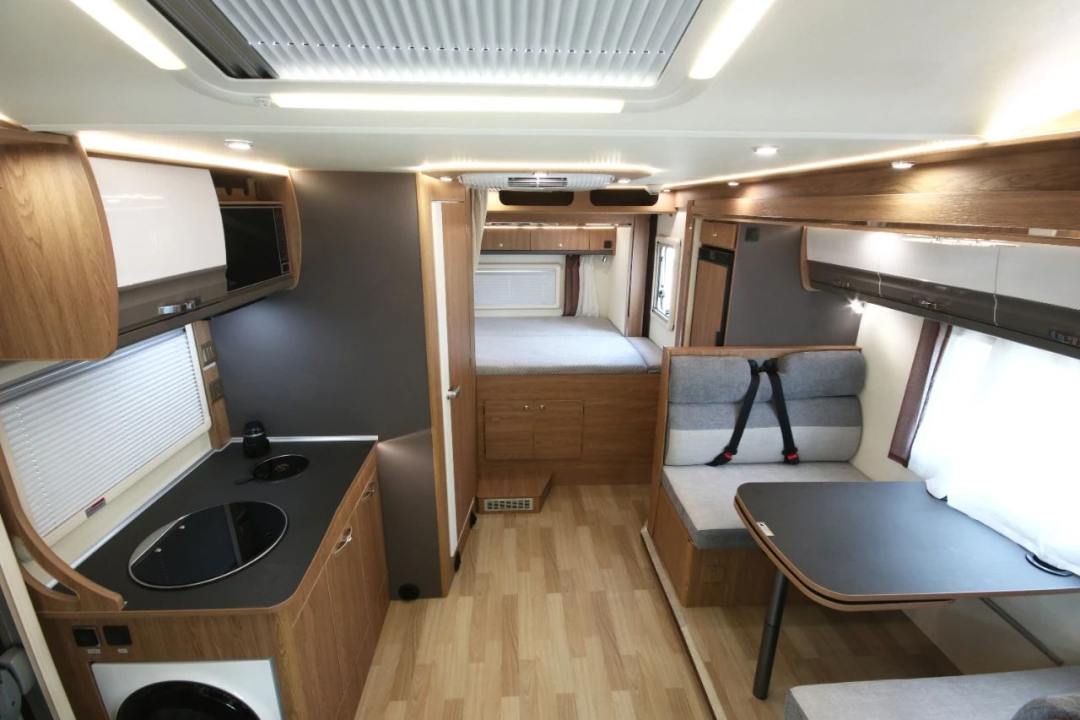 现代简约内饰设计,橡木色家具搭配灰白色沙发,干净温馨;额头床+卡座拼床+尾横床布局,功能区布局合理,可满足一家人外出旅行;水路系统配备185L净水箱、80L污水箱等。
