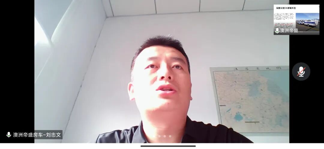 澳洲帝盛房车销售部部长-刘忠文先生由于距离较远的原因无法达到会议现场,但也通过线上视频连线的方式为大家带来了以“C6驾照相关政策解读”为主题的精彩分享,为听会观众详细介绍了C6驾照政策出现背后的故事,以及C6驾照准驾车型的解读。