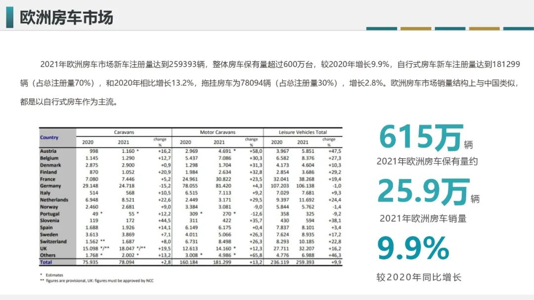 欧洲在房车销量结构及驾照政策方面,与我国较为相似;销量方面,2021年,欧洲房车全年新车注册量为259393辆,整体保有量约为615万辆,相较往年同比增长9.9%;销量结构上,2021年欧洲自行式房车新车注册量为181299辆,占总注册量70%,拖挂式房车则为78094辆,占总注册量的30%。欧洲房车市场在消费结构上与我国类似,都是以自行式房车为主,造成这种现象的因素,除了道路交通、人口、配套设施规划完善以外,还有精细、成熟化的驾照政策影响。