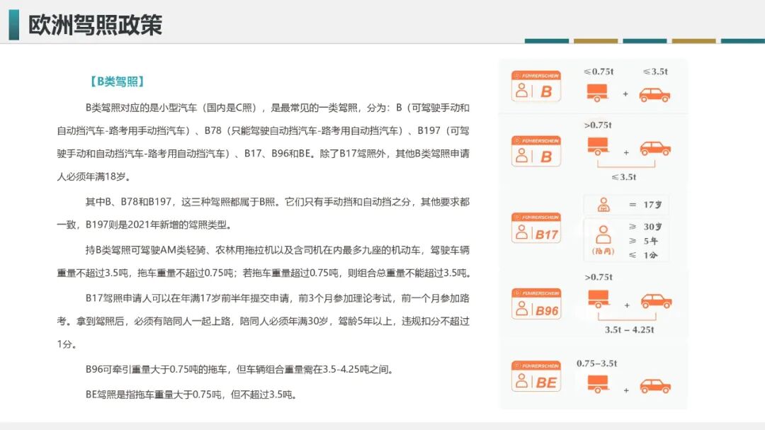 其中B类相当于我国的C类驾照,主要对应小型汽车,不过与我国C类驾照的区别在于,欧洲的B类驾照除了允许驾驶手动/自动挡小型汽车以外,还允许小于等于3.5吨的小型汽车牵引一辆小于等于0.75吨的挂车,同时也允许小型汽车牵引大于0.75吨的挂车,但前车+后车的重量需小于等于3.5吨;