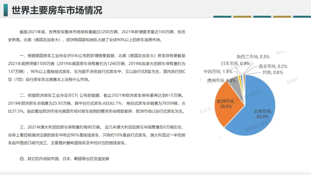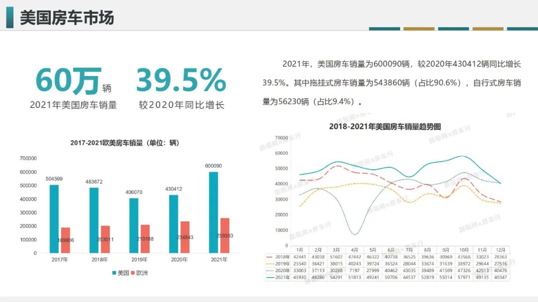 作为全球最大的房车市场,美国在2021年的房车销量首次突破60万大关,创了美国房车市场的历史之最;欧洲在全年销量也刷新了记录,并在保有量方面600多万台;美国、欧洲作为全球房车最大的两个市场,基本占了市场的90%以上。销量火热的背后,和美欧房车市场有着完善的房车配套设施以及较为成熟的房车政策息息相关。