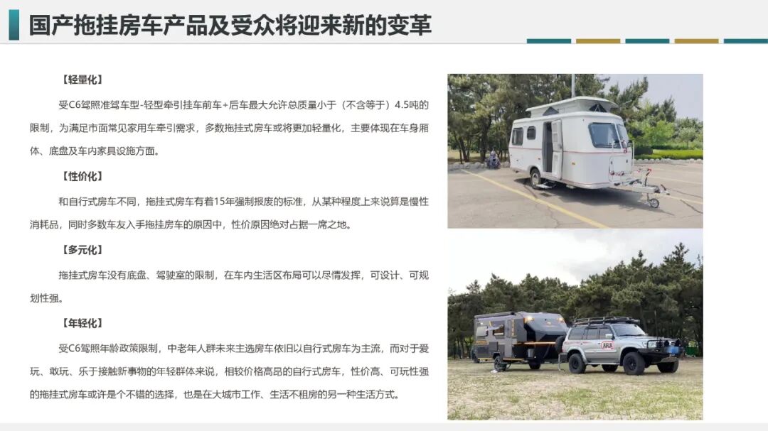 相关政策也在为适应老龄化社会发展新需求不断进行改变,如取消老年人C照年龄的限制,便利老年人考取驾照,放宽C6驾照申请增驾年龄限制等政策的出炉,进一步释放老年市场消费潜力,也为国产房车行业带来新的机遇;