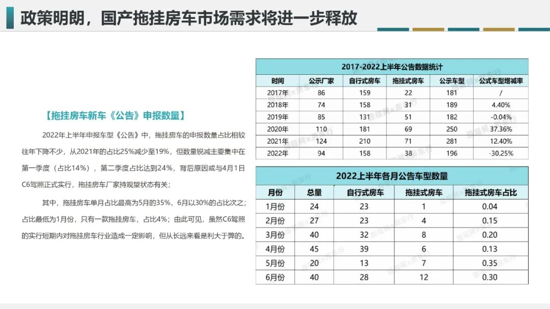 2022年上半年申报车型《公告》中,拖挂房车的申报数量占比相较往年下降不少,从2021年的占比25%减少至19%,但数量锐减主要集中在第一季度(占比14%),第二季度占比达到24%,背后原因或与4月1日C6驾照正式实行,拖挂房车厂家持观望状态有关;