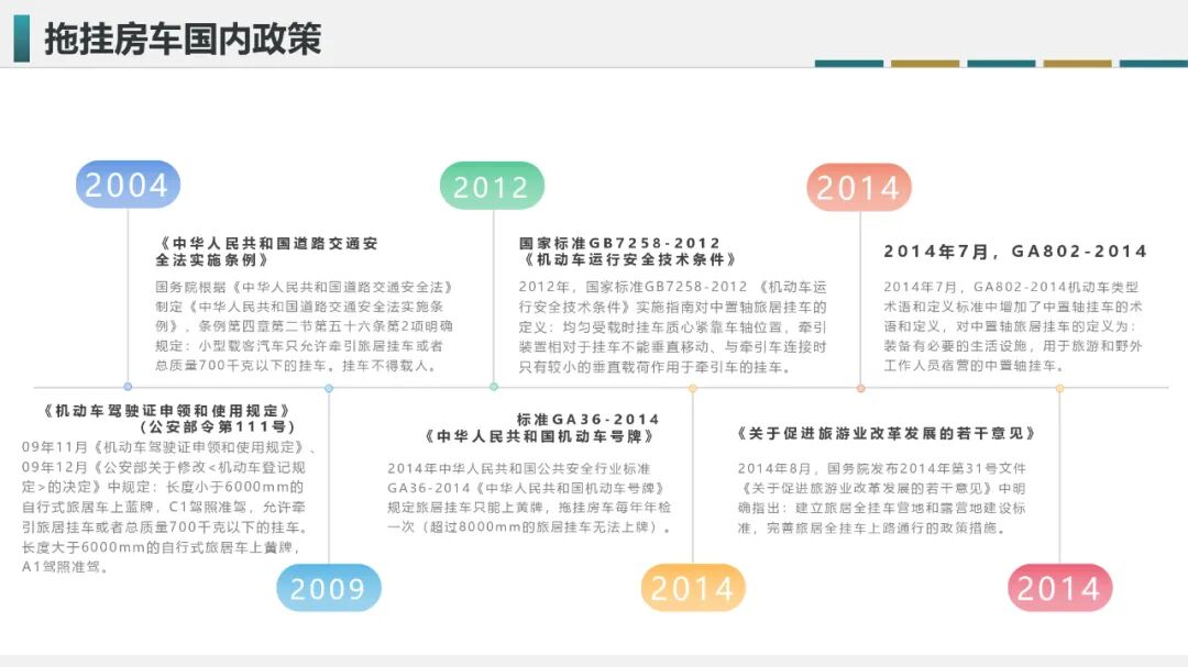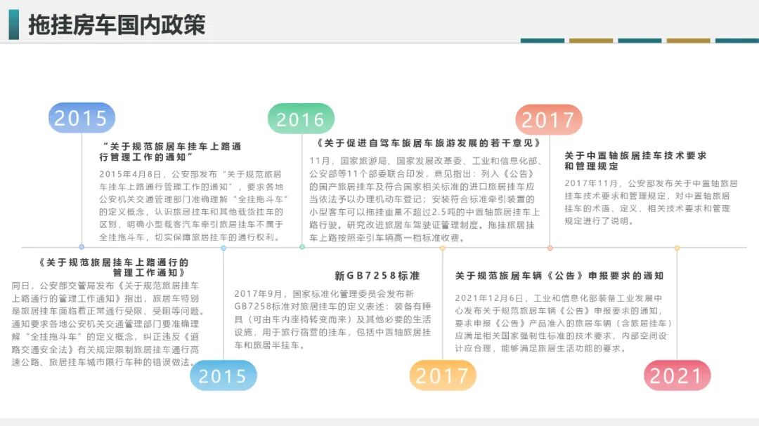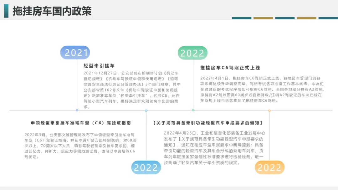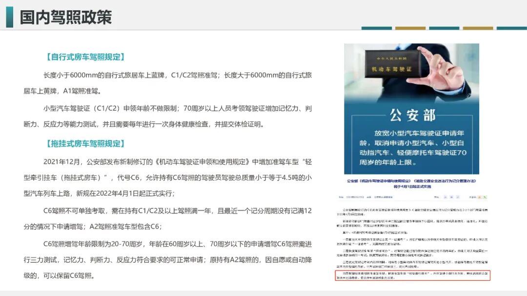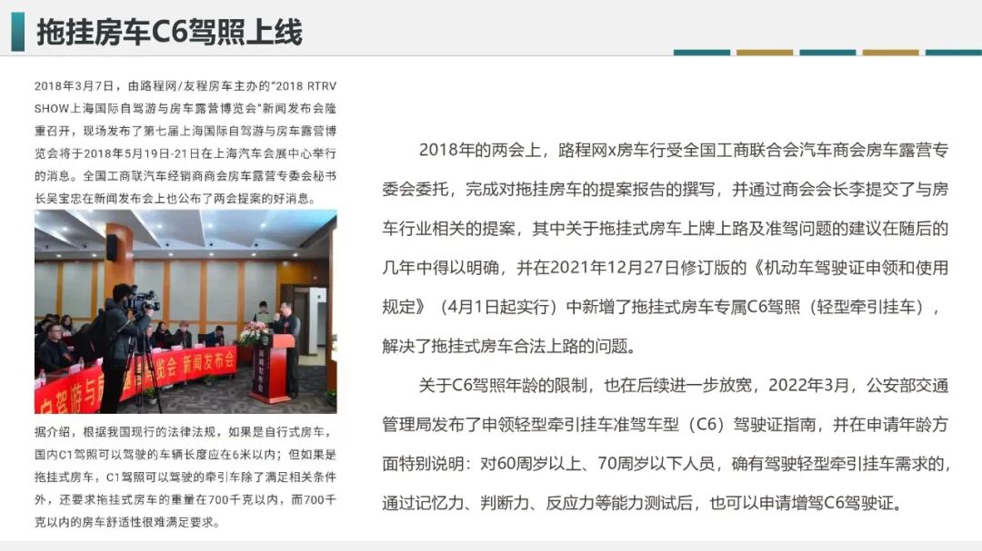 随后在2018年的两会上,路程网x房车行完成对拖挂房车提案报告的撰写,并通过商会会长李响提交了与房车行业相关的提案;其中,关于拖挂式房车上牌上路及准驾问题的建议在随后的几年中得以明确,并在2021年12月27日修订版的《机动车驾驶证申领和使用规定》(2022年4月1日实行)中新增了拖挂式房车专属C6驾照(轻型牵引挂车),解决了拖挂式房车合法上路的问题。