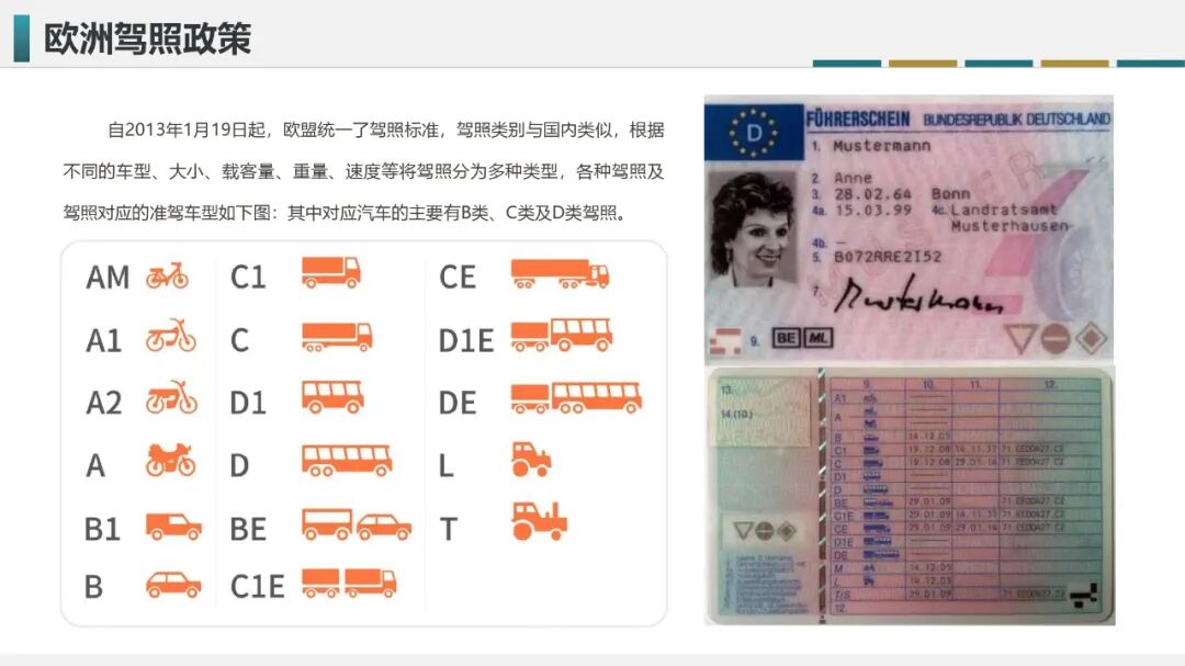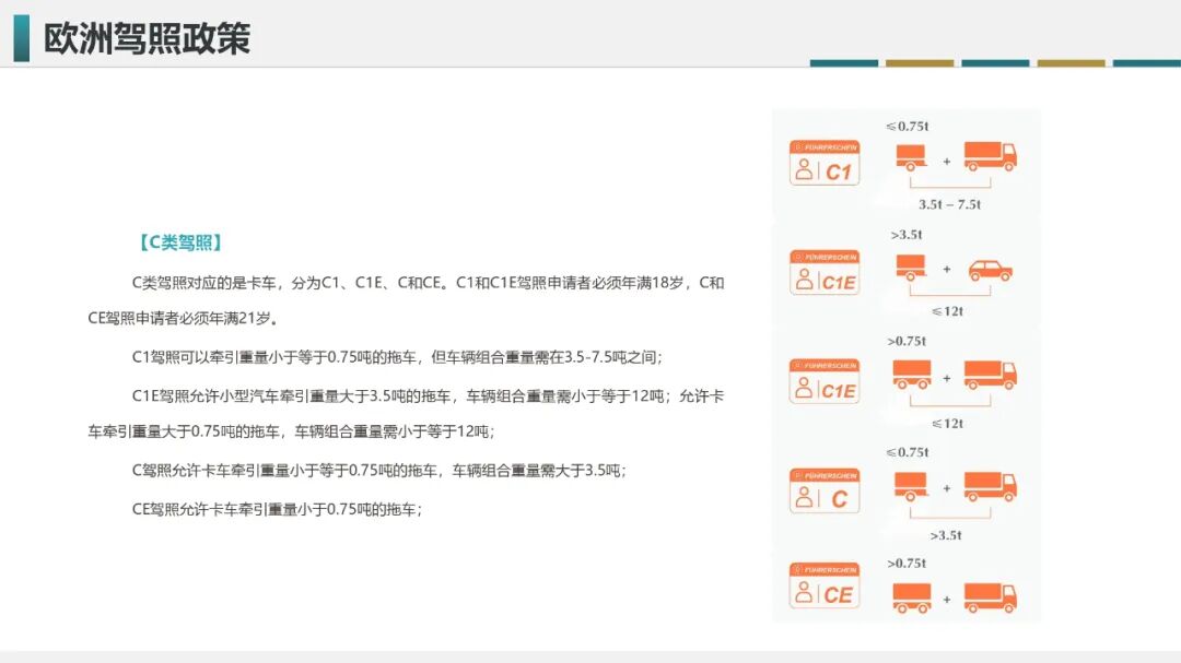 欧洲的C类驾照主要对应卡车,分为C1、C1E、C、CE,准驾车型与我国A2驾照相似,但在准驾车型上划分更为精细;