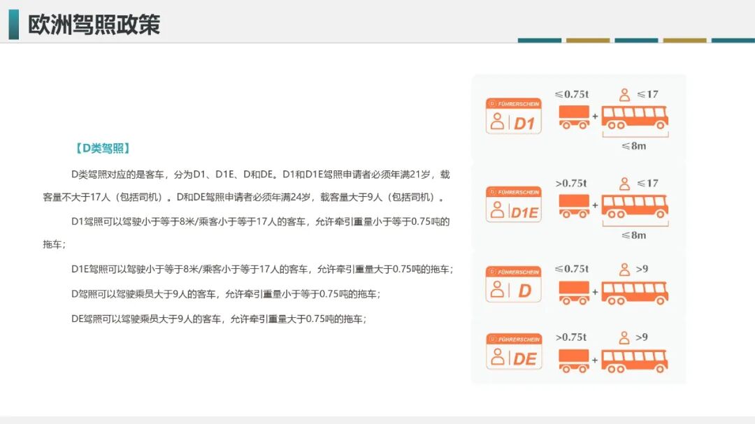 欧洲D类驾照对应的则是大型客车,除了允许驾驶大型客车以外,还允许客车牵引一定重量的拖车,D类驾照分为D1、D1E、D、DE,不同类别对应的准驾车型和允许牵引挂车重量也有所区分。