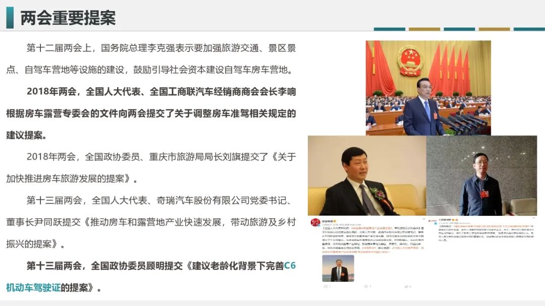丁宏波先生表示,房车露营产业的发展离不开两会的助力,过去几年,两会多次出现与房车、房车露营地、房车准驾相关政策法规相关的提案;今年第十三届两会上,全国人大代表、奇瑞汽车股份有限公司党委书记、董事长尹同跃提交了《推动房车和露营地产业快速发展,带动旅游及乡村振兴的提案》;全国政协委员顾明提交《建议老龄化背景下完善C6机动车驾驶证的提案》,则进一步推动了C6驾照申驾年龄限制政策的完善。