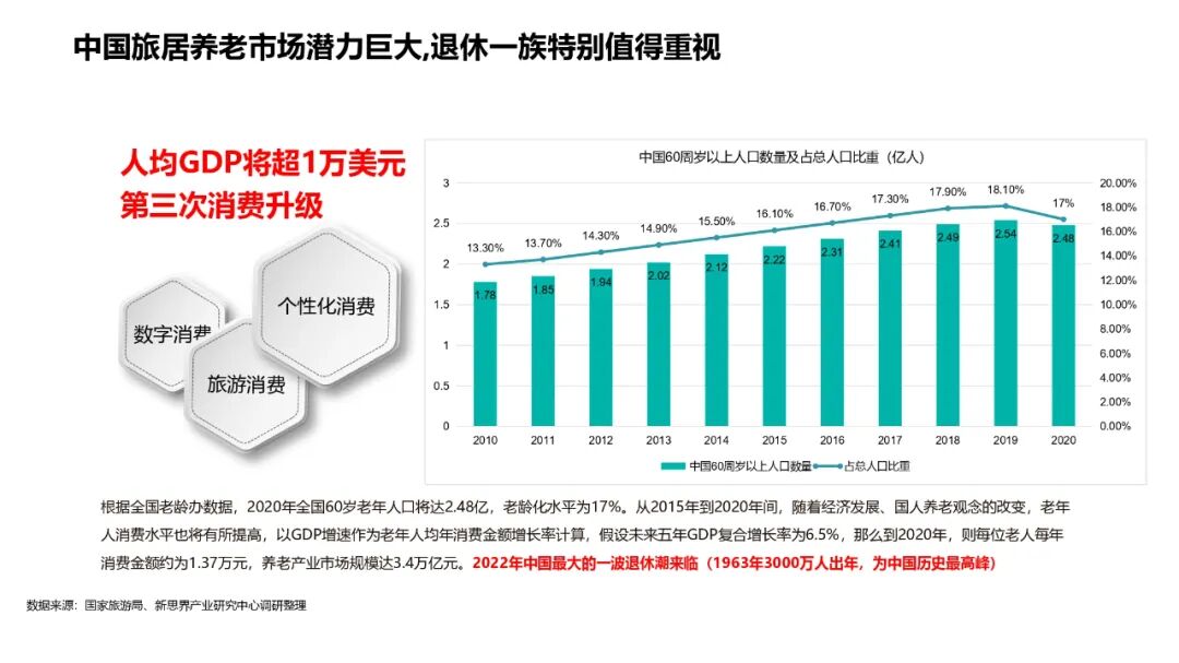 此外,他还表示,国产房车,包含自行式房车、拖挂式房车,正在迎来快速发展的黄金时代;根据路程网x房车行在往年举办的大型国际房车展的参展人员调研来看,参展观众中退休人员占比接近一半,房车市场快速发展的背后,中老人承担着国产自行式房车年度销量的主力。而在2022年,中国最大一波退休潮正来临,中国旅居养老市场潜力巨大,作为房车消费的主要群体,或将带动国产房车市场及相关配套产业发展提速。