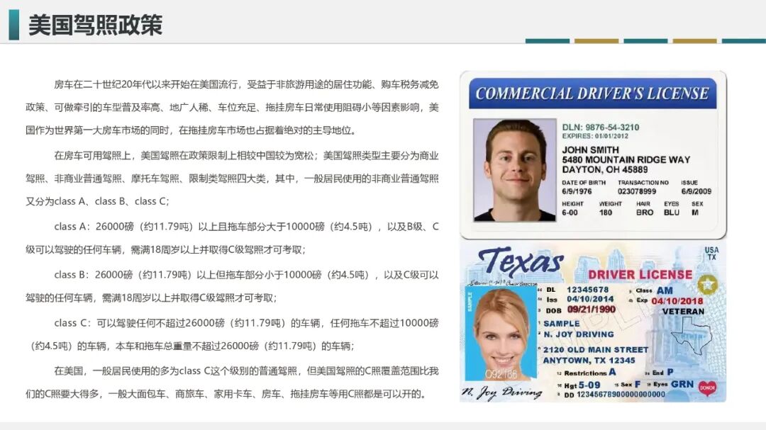 丁宏波先生表示,美国驾照政策相对国内来说比较宽松,按照使用场景、类型主要分为商业驾照、非商业普通驾照、摩托车驾照、限制类驾照四大类;其中,一般居民使用的非商业普通驾照又按照吨位分为class A、class B、class C;