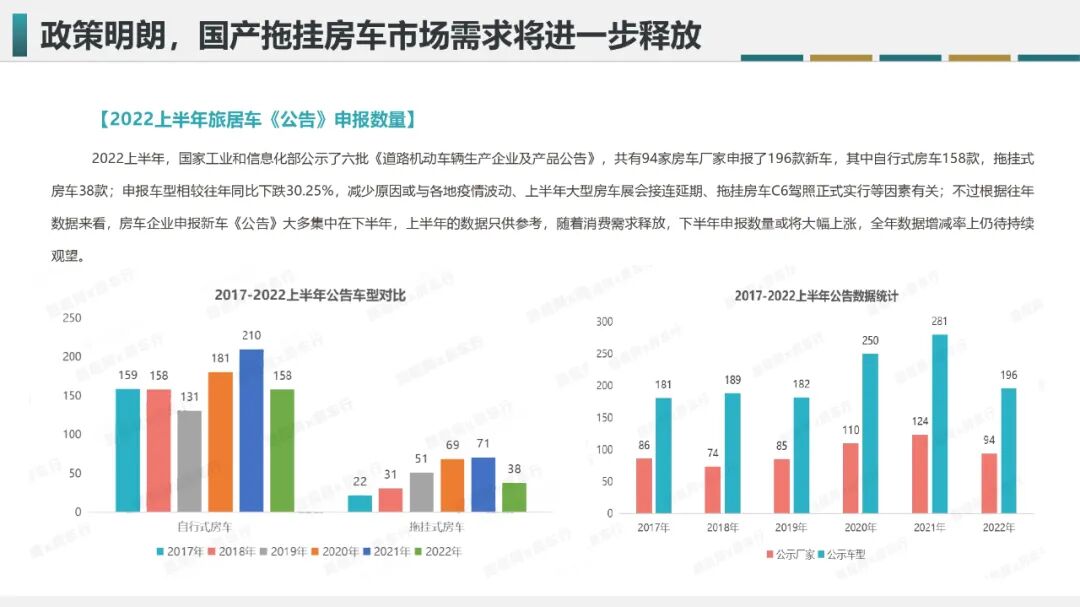 丁宏波先生认为,虽然C6驾照未明确前,拖挂房车市场低迷,单从市场长远发展来看还是利远大于弊的,这些从拖挂房车生产厂家申报《公告》车型数量中可以看出。